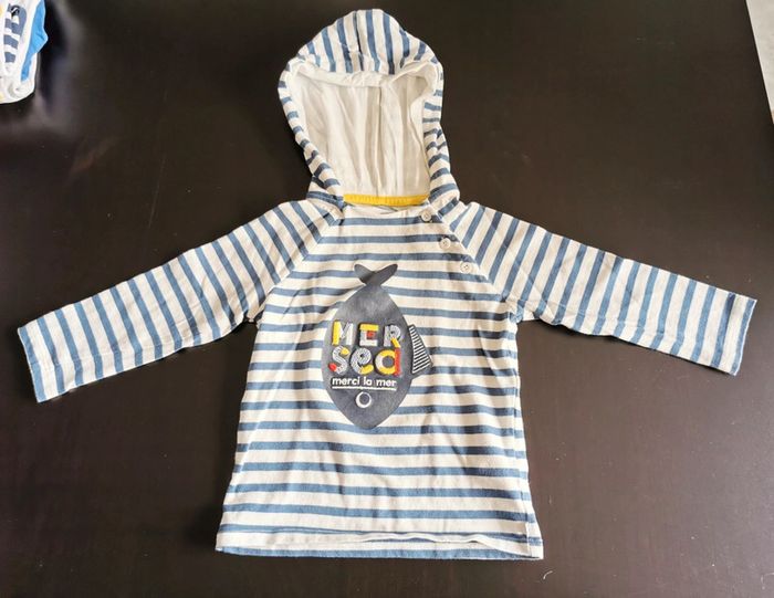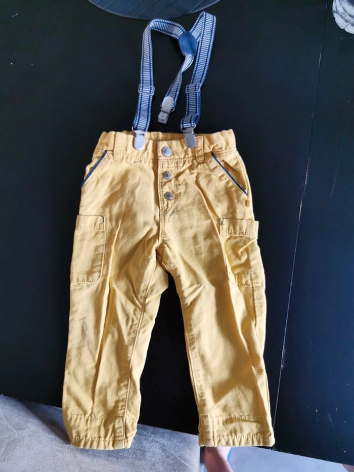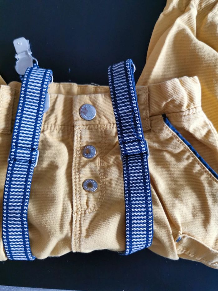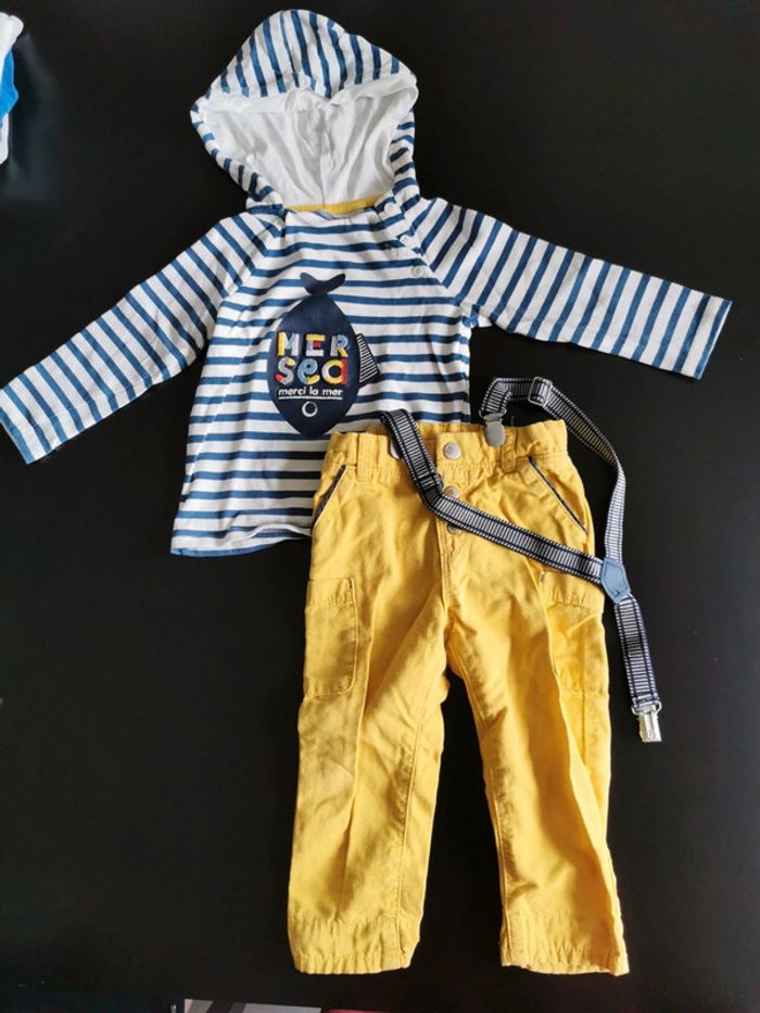 Ensemble obaibi -Sweat a capuche fin Couleur marinière -Pantalon jaune - bretelles amovibles Marque obaibi Taille 18 mois. Très bon état #leeloo3582_18mois