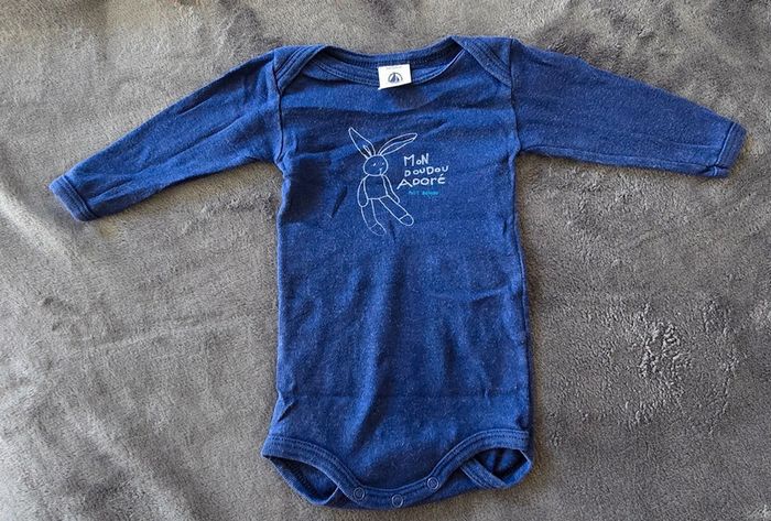 Vends body garçon à manches longues de la marque Petit Bateau. Inscription à l'avant "mon doudou adoré" avec motif lapin. Très bon etat. Taille 3 mois 60cm