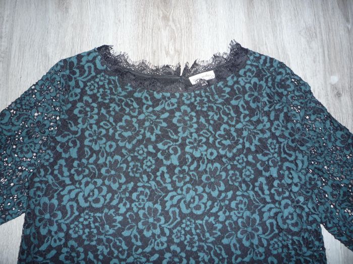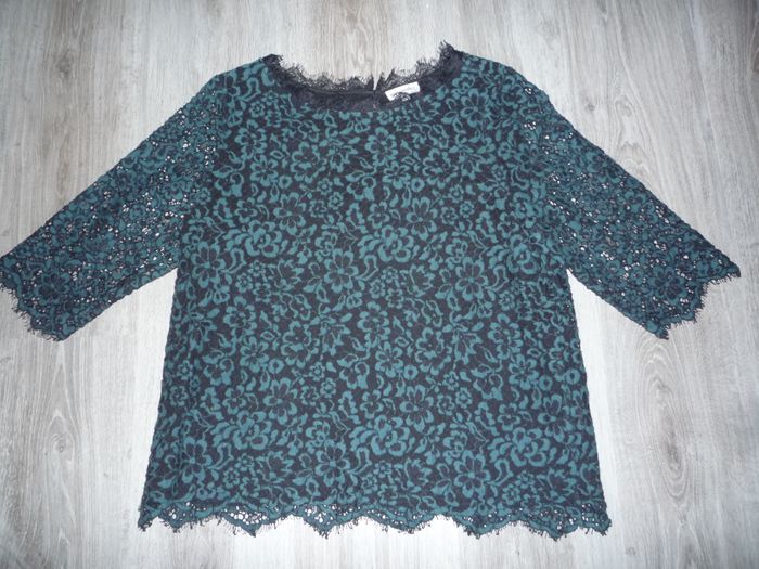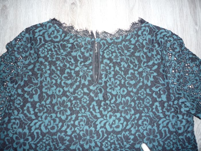 CHEMISIER M 3/4 VERT ET NOIR "GRAIN DE MALICE" - TAILLE 44 - n°01 Chemisier à manches 3/4 en dentelle vert et noir - Manches transparentes - Col rond avec dentelle noire - Fermeture dos par 1 bouton - Matière principale 42% polyamide 31% polyester et 2% coton - Doublure 100% polyester - Dimensions épaule à épaule 40 cm et longueur totale 59 cm. Article d’occasion en très bon état - Sans trou - Ni tache - Lavé et repassé pour la vente. Possibilité d'envoyer d'autres photos sur simple demande. Allez voir mes autres ventes, je vide les placards. Beaucoup de vêtements de marque et beaucoup de jouets. Maison non-fumeur - Sans animaux. Réduction lot activée. Remise en mains propres ou possibilité d'envoi au tarif en vigueur à votre charge. Retour Refusé. Pour tout renseignement, n'hésitez pas à me contacter, je répondrai volontiers à vos questions. Réponse Assurée. Pour Consulter mes autres annonces tapez Nathg2210.