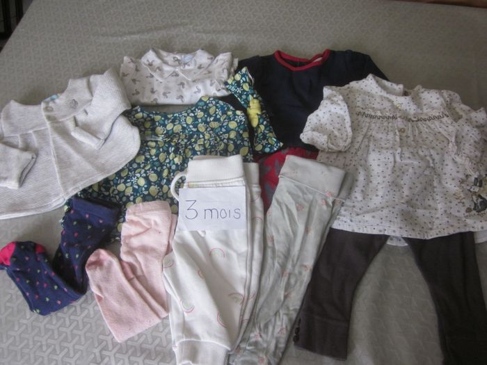 3m, 3 pantalons + 2 hauts ml + robe ml + bandeau coordonné + 2 collants + veste molletonnée offerte (tâche), dpam, obaibi, h&m