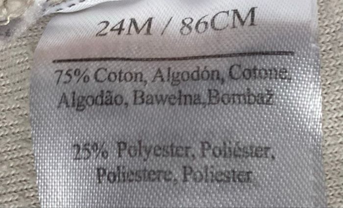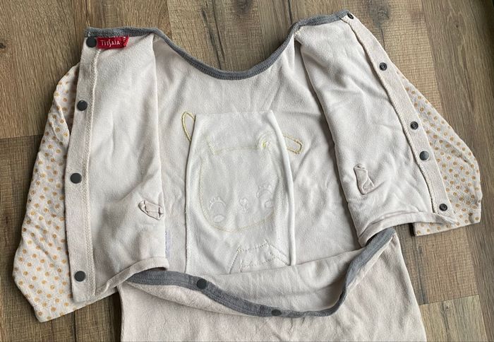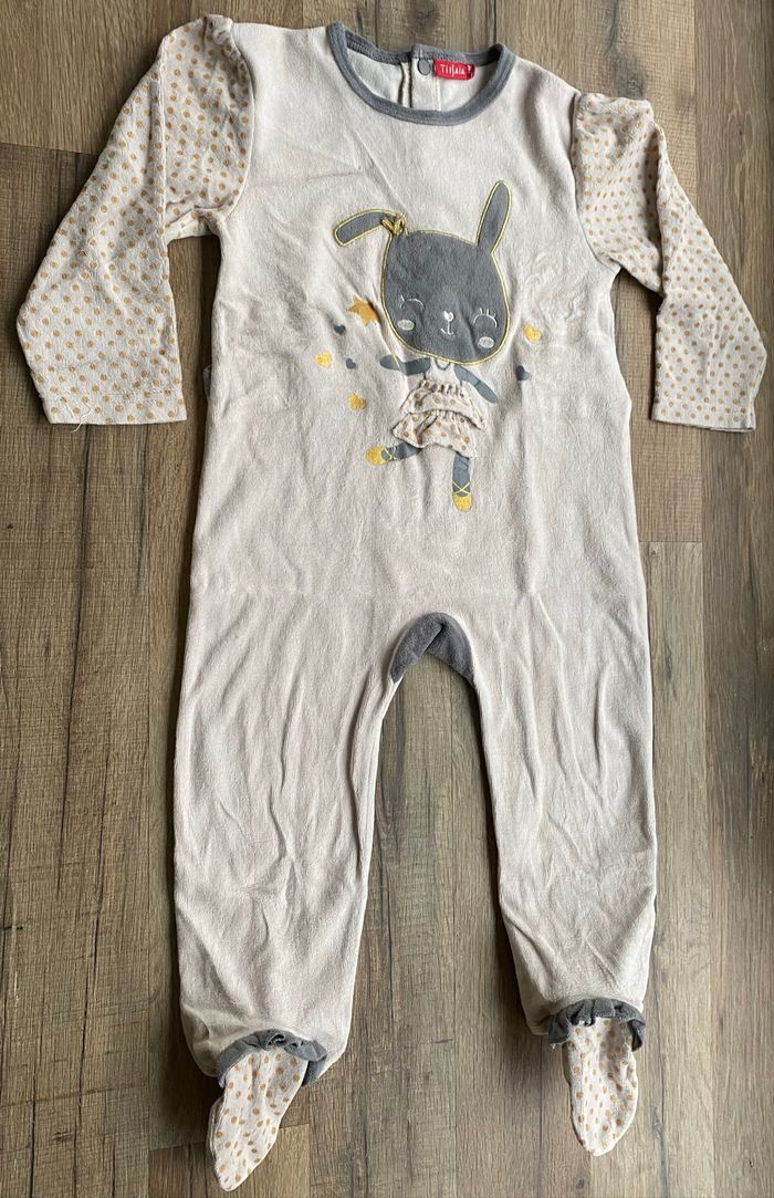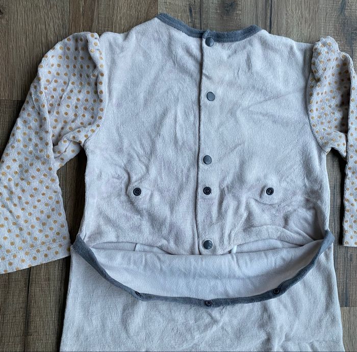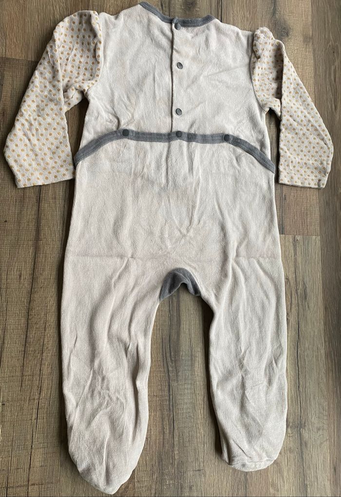 Pyjama 1 tache sur la manche voire photo Ouverture dans le dos en 2 temps avec 7 pressions 3 pressions ouverture fesses 4 pressions le dos 24 mois. Dessin non abîmé voire photo 25% polyester 75% coton