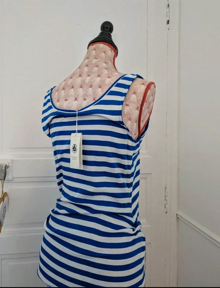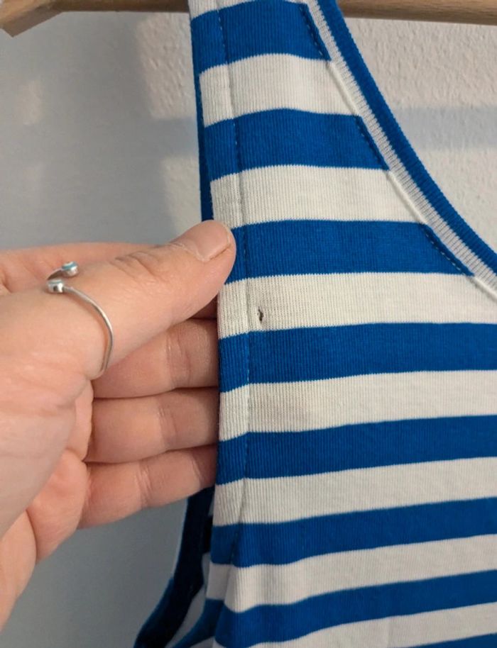 Cette robe paréo trompe l'oeil est réalisée dans notre côte 1x1. Le haut est un débardeur et le bas se noue comme un paréo devant. Disponible en tailles. bleu PERSE/blanc MARSHMALLOW Ref 4472948220 Un petit accroc au niveau de la manche à l'arrière de la robe