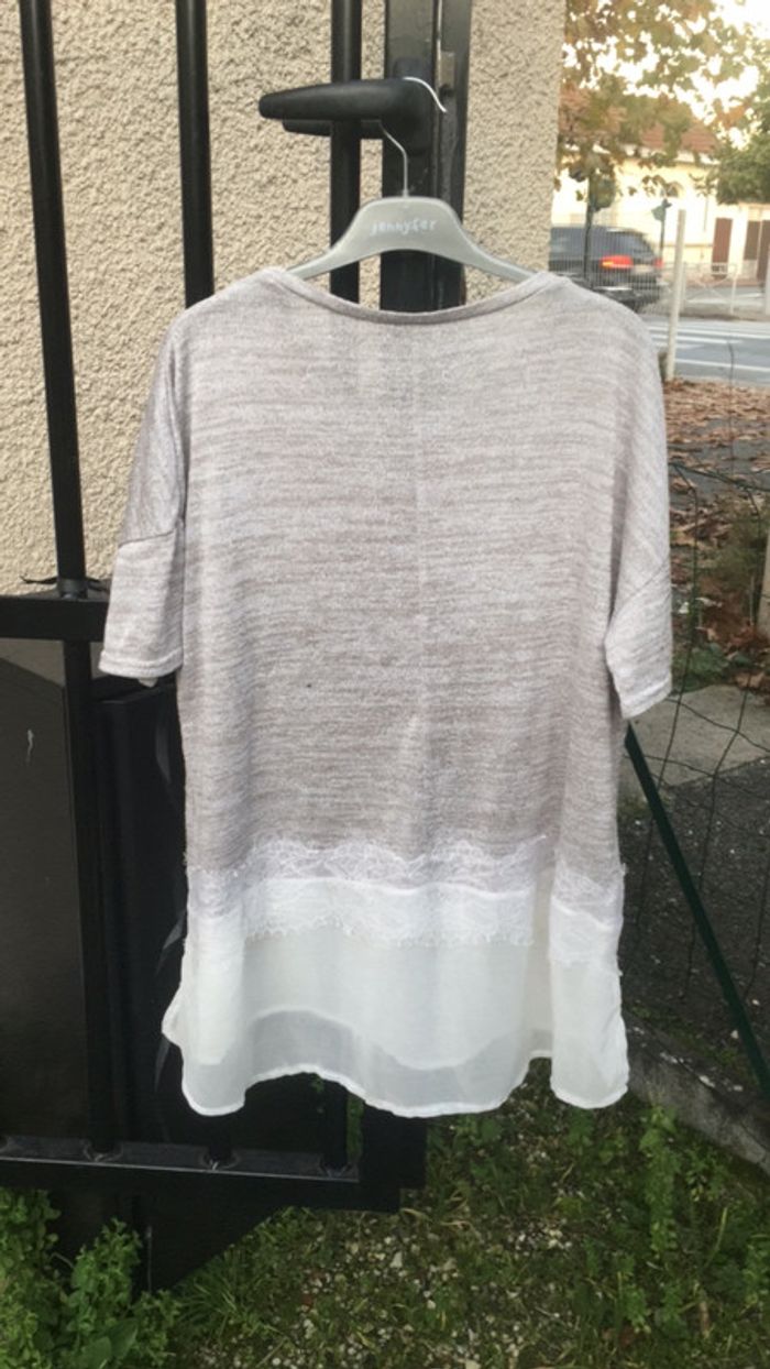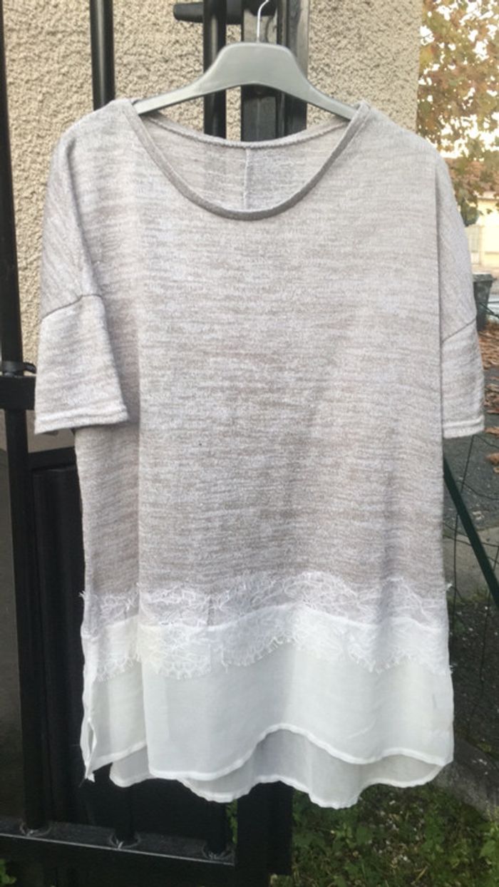 Blouse grise beige à manches courtes avec jolies finitions en dentelle, peu portée, pas de défaut. Achète en lot ✨ -5% pour 2 -10% pour 3 -15% pour 5 #blouse #blousefemme #blouseàdentelle #blousemanchescourtes #blouselongue #gris #beige #dentelle #blanc #dentelleblanche #manchescourtes #longue #teeshirt #teeshirtlong #teeshirtadentelle
