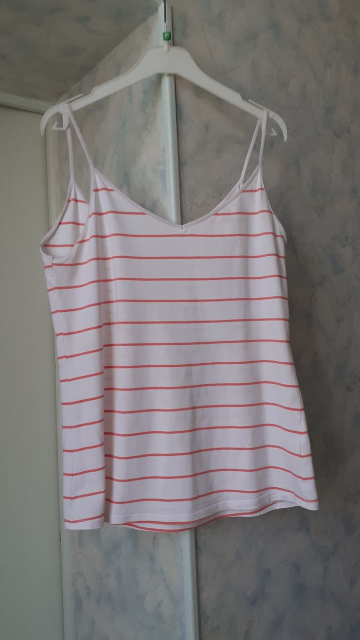 Vends un débardeur à fines bretelles 95 % coton, 5 % élasthanne, couleur blanc avec rayures corail, marque Camaïeu, taille XL sur l'étiquette mais plutôt taille 40. Longueur de l'épaule à la base : 65 cm Largeur aisselle à aisselle : 44 cm Largeur au niveau des hanches : 47 cm.