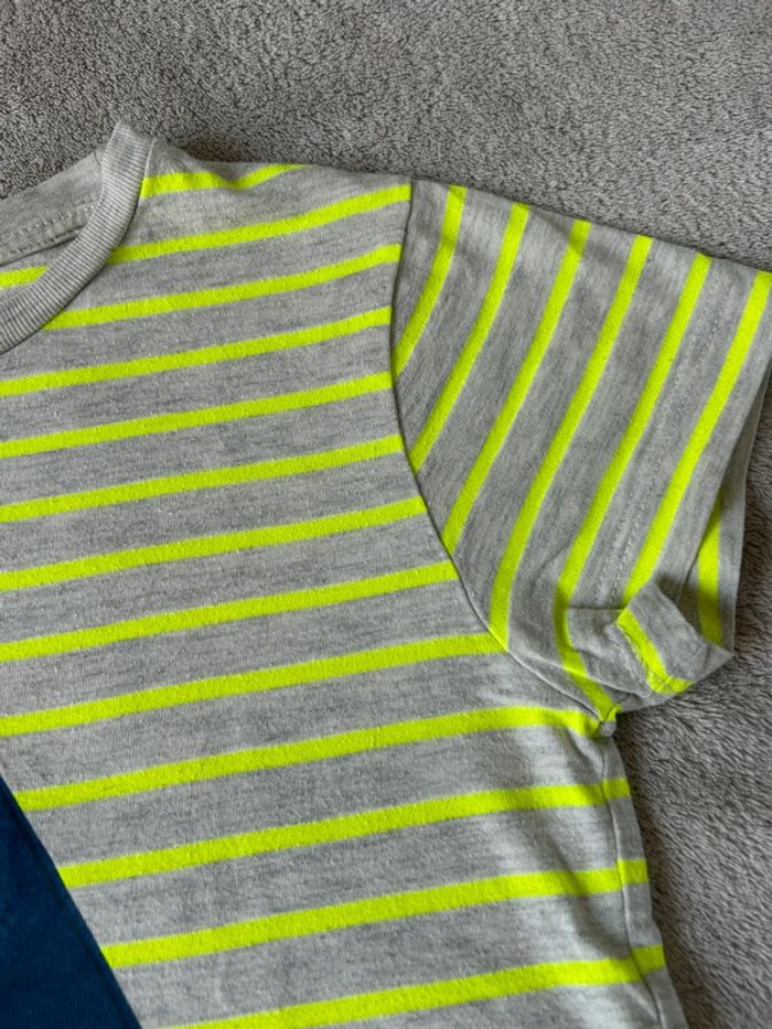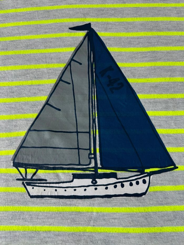 T-shirt Monoprix 5 ans vert fluo et gris. Thème bateau navire.