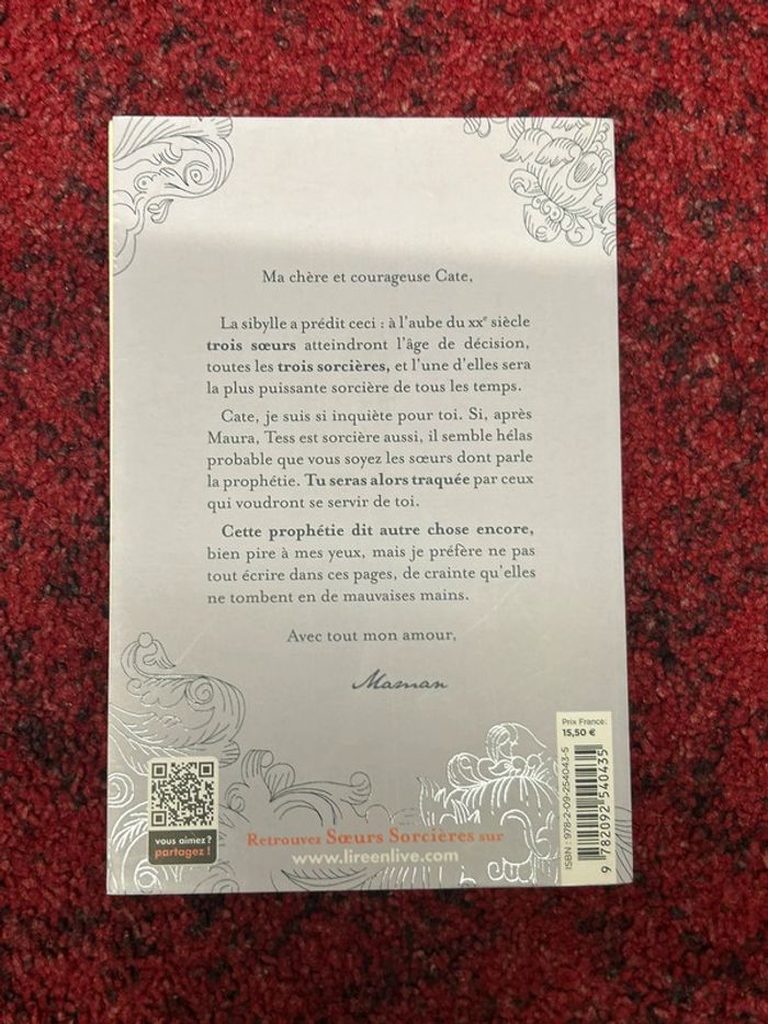Livre Sœurs sorcières tome 1 Roman Sœurs sorcières JESSICA SPOTSWO tome 1 9782092540435 🌸 pour voir mes autres livres cliquez ici #livres_loena38 📕 Ma chère et courageuse Cate, La sibylle l'a prédit : à l'aube du xxe siècle, trois soeurs sorcières atteindront l'âge de décision. L'une d'elles sera la sorcière la plus puissante de tous les temps. Il semble hélas probable que Tess, Maura et toi soyez les soeurs dont parle cette prophétie. Si c'est le cas, tu seras traquée par ceux qui voudront se servir de toi. Je suis si inquiète ! La prophétie dit une autre chose, encore pire à mes yeux. Mais je préfère ne rien révéler de plus dans ces pages, de crainte qu'elles ne tombent entre de mauvaises mains. Avec tout mon amour, Maman ;