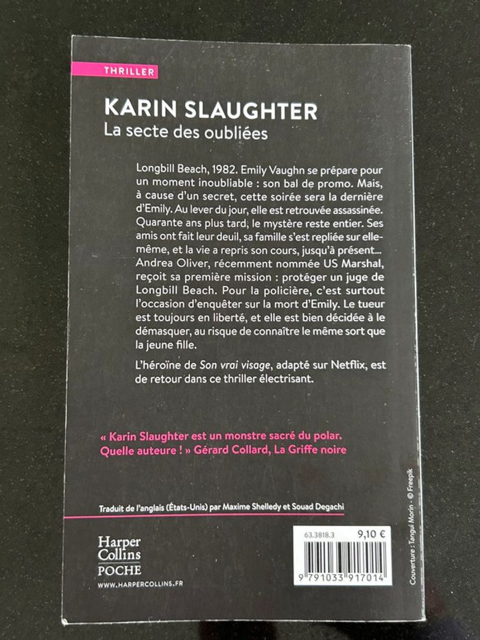 KARIN SLAUGHTER La secte des oubliées En bon état pages légèrement jaunis Longbill Beach, 1982. Emily Vaughn se prépare pour un moment inoubliable : son bal de promo. Mais, à cause d’un secret, cette soirée sera la dernière d’Emily. Au lever du jour, elle est retrouvée assassinée. Quarante ans plus tard, le mystère reste entier. Ses amis ont fait leur deuil, sa famille s’est repliée sur elle-même, et la vie a repris son cours, jusqu’à présent… Andrea Oliver, récemment nommée US Marshal, reçoit sa première mission : protéger un juge de Longbill Beach. Pour la policière, c’est surtout l’occasion d’enquêter sur la mort d’Emily. Le tueur est toujours en liberté, et elle est bien décidée à le démasquer, au risque de connaître le même sort que la jeune fille. L’héroïne de Son vrai visage, adapté sur Netflix, est de retour dans ce thriller électrisant. Traduit de l’anglais (États-Unis) par Maxime Shelledy et Souad Degachi. 🌸 pour voir mes autres livres cliquez ici #livres_loena38 📕
