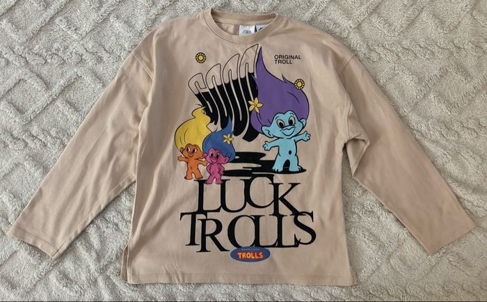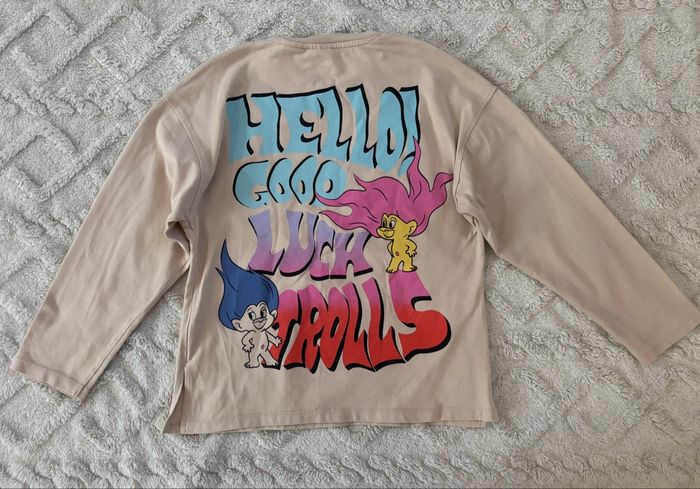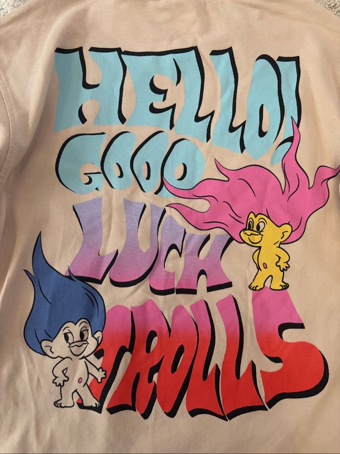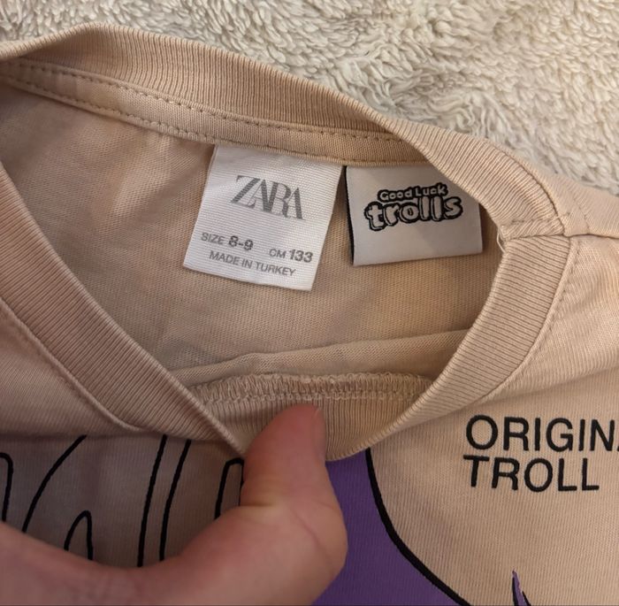 • 8-9 ans - 133cm. Taille 9 ans. Acheté chez Zara. Les trolls. Etiquette de composition coupée. Dessins devant et derrière.