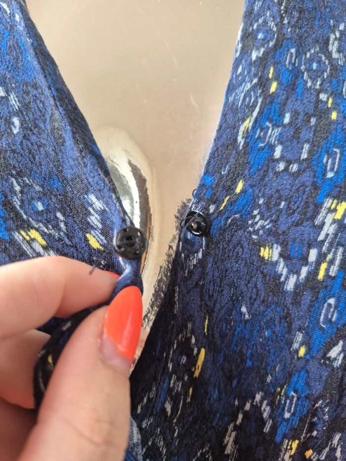 Ouverture par bouton pression Pas de taille donc voici les mesures à plat = Aisselle à aisselle 46cm Épaule à épaule 38cm Longueur 51.5cm Pas d'étiquette pour la matière désolé. #papillonduvarmanchelongue #papillonduvarfemme