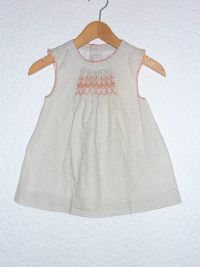 Robe vichy beige de marque CYRILLUS, en excellent état, à smocks et broderies couleur corail.