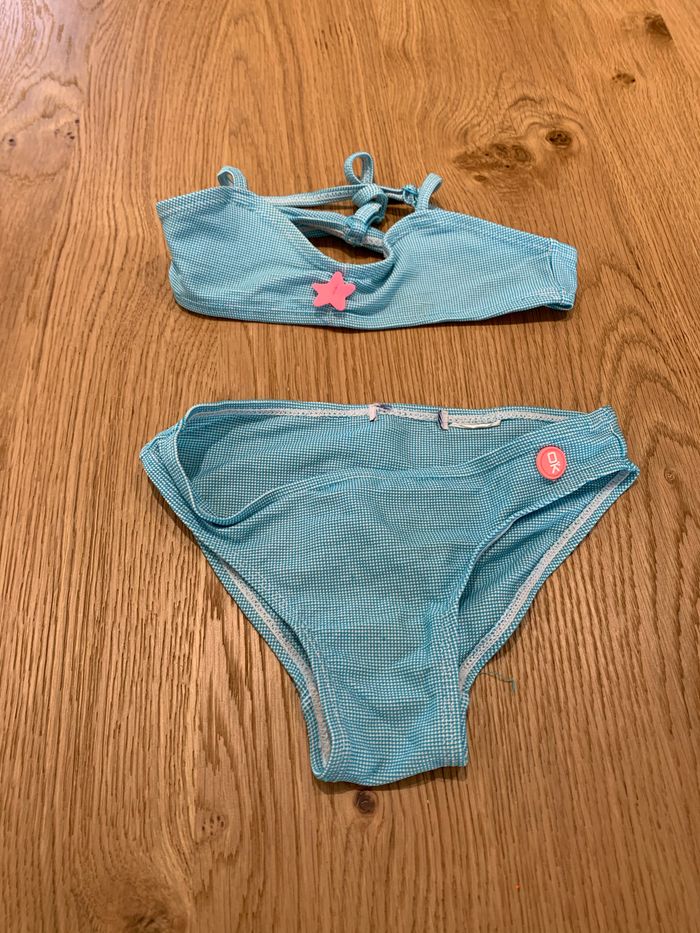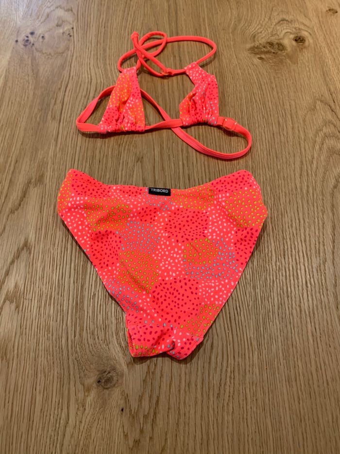 Lot comprenant 2 maillots de bains 2 pièces : . un orange/corail en très bon état, taille 3 ans, de marque Tribord . & un bleu turquoise, en bon état (quelques fils tirés au dos de la culotte ; cf. photo), taille 3 ans, de marque Okaïdi.