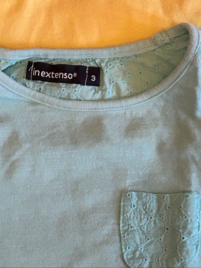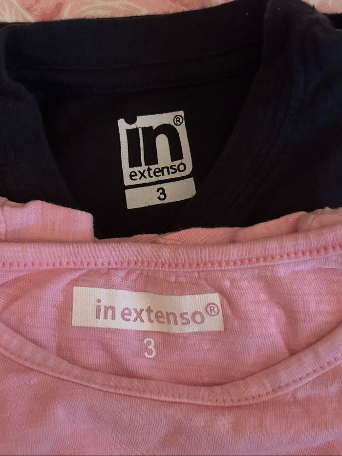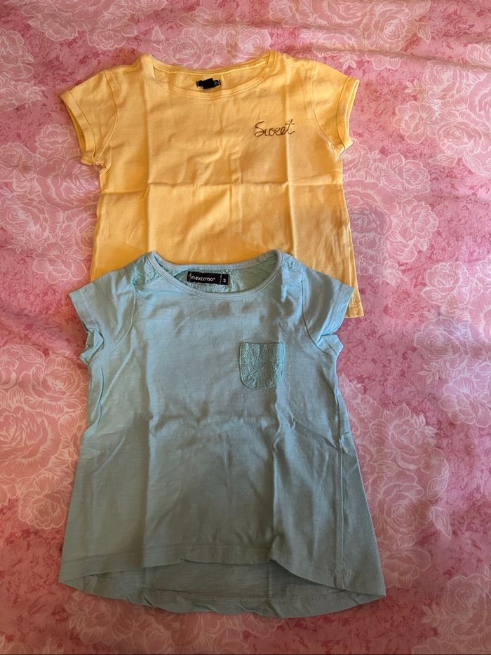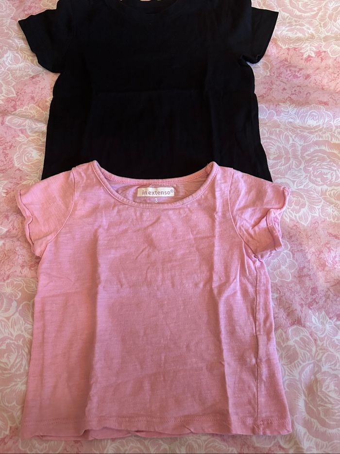 Lot de 4 t-shirts à manches courtes fille, taille 3 ans. -1 noir, 1 rose pâle de la marque « Inextenso ». -1 jaune et 1 turquoise avec empiècements en dentelle de la marque « Kiabi ». En excellent état.