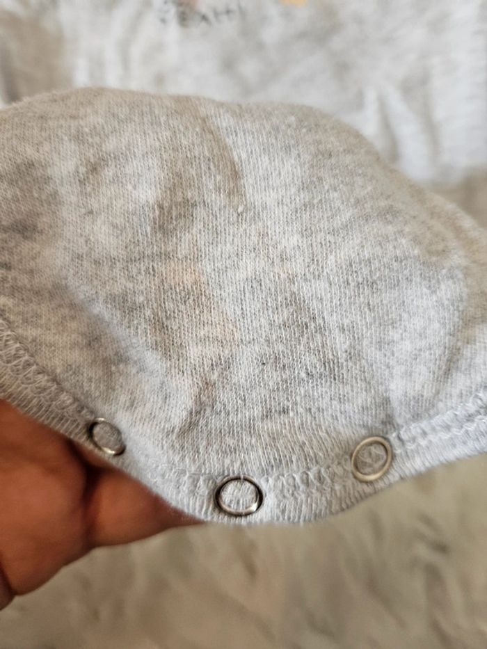 Body en coton gris clair, manches courtes, avec un petit hibou trop mignon de la marque Pommette. Taille 24 mois. ✅ Bon état général ⚠️ Une petite tâche légère (voir photo) Parfait pour compléter la garde-robe de bébé à petit prix !