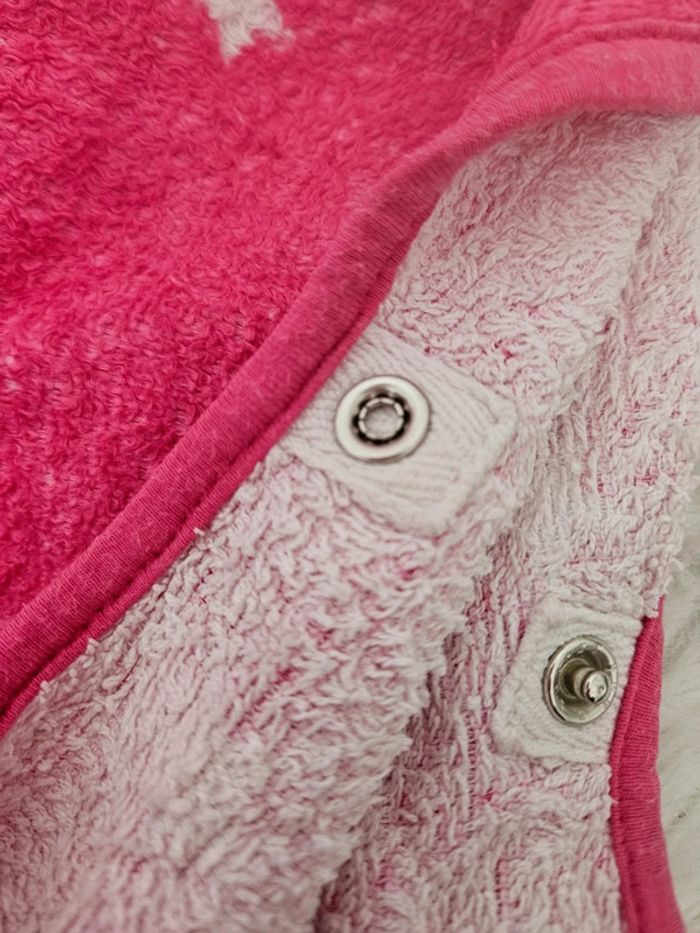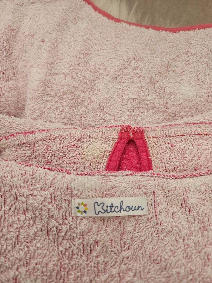 Cape de bain Kitchoun, taille 3/4 ans, en coton éponge. Coloris rose fuchsia avec étoiles blanches, capuche intégrée. Pressions sur les côtés pour passer les bras – très pratique après le bain ou à la plage. ✅ Bon état général, aucun défaut. ⚠️ Tissu légèrement rêche (moins doux qu’à l’origine) en raison de l’utilisation – prix ajusté en conséquence.