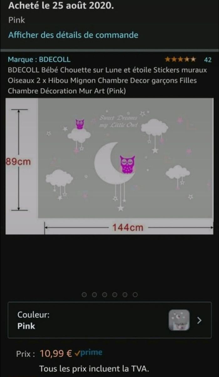 Stikers muraux acheté le 25 août 10.99€ sur amazon mais la couleur ne me convient pas avec celle mise au mur ils sont neuf juste déballé mais pas décollé de la feuille...