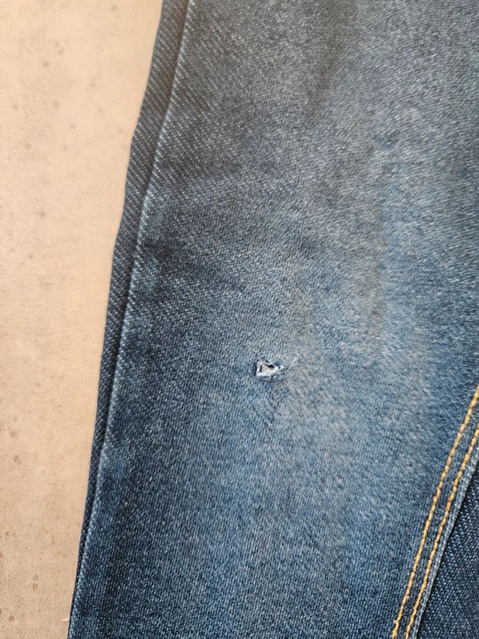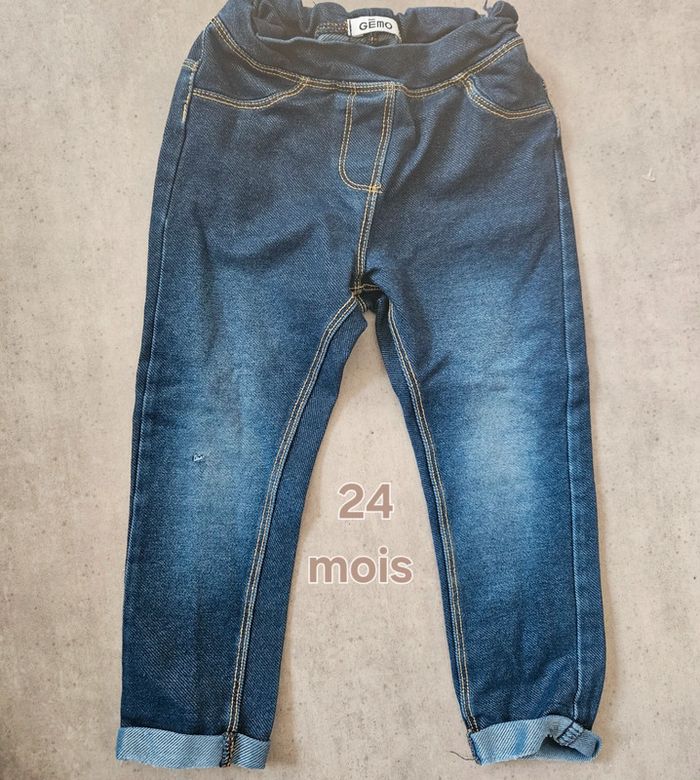 Merci de bien lire la description 👉 Pantalon type legging bleu foncé avec effet jean. Taille : 24 mois Marque : Gémo Ceinture élastique réglable avec boutons à l’intérieur pour un bon maintien. Petites poches à l’arrière, très mignon et confortable. ⚠️ Bon état général, à noter : un petit accroc/trou sur la jambe droite (visible sur photo), d’où le prix réduit. Idéal pour jouer ou pour un look décontracté 👖 N’hésite pas à me demander plus de photos ou infos !