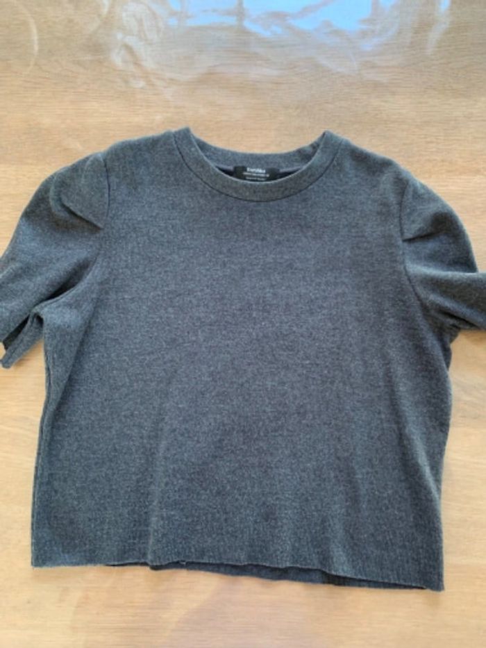 Tee-shirt gris Bershka Tissu épais , un peu comme un pull Se porte court, près du corps , longueur 45 cm Les manches courtes mesurent 24 cm, elles arrivent au dessus du coude