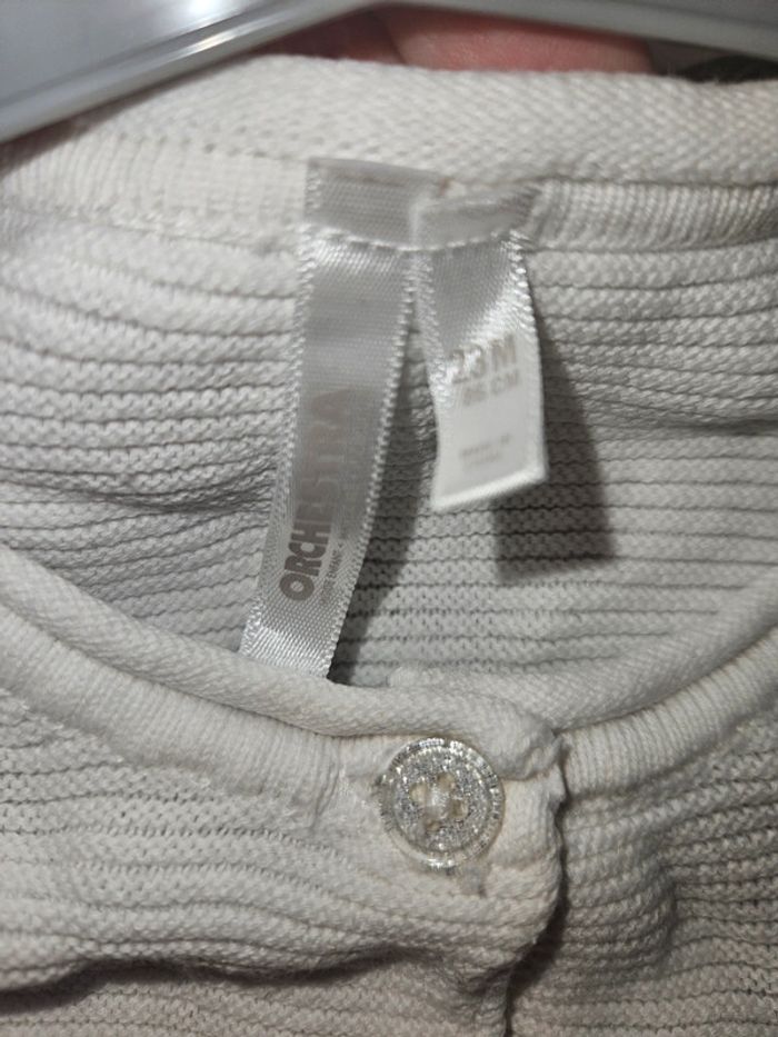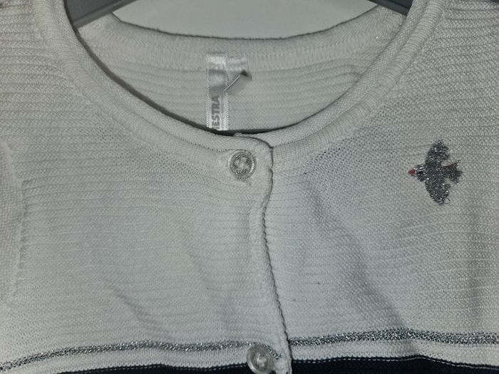 Très joli gilet légèrement épais de la marque Orchestra. Couleur principale : blanc, avec rayures bleues, argentées et roses. Petit oiseau gris argenté brodé sur le côté, boutons pailletés pour une touche brillante. Très bon état, aucun défaut. Taille : 23 mois / 86 cm. 100% coton Parfait pour la mi-saison. N’hésitez pas à me contacter si vous avez des questions 😊