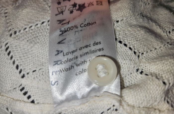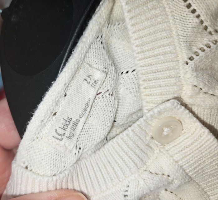 Merci de bien lire l'annonce 👉 Gilet blanc à maille fine de la marque Little Cigogne, taille 24 mois (86 cm). En bon état général, confortable et idéal pour la mi-saison. ➡️ À noter : ⚠️ Quelques légères taches jaunes sur les manches (discrètes, voir photos) 👉 Prénom de l'enfant tamponné sur l’étiquette (zone du bouton de rechange)