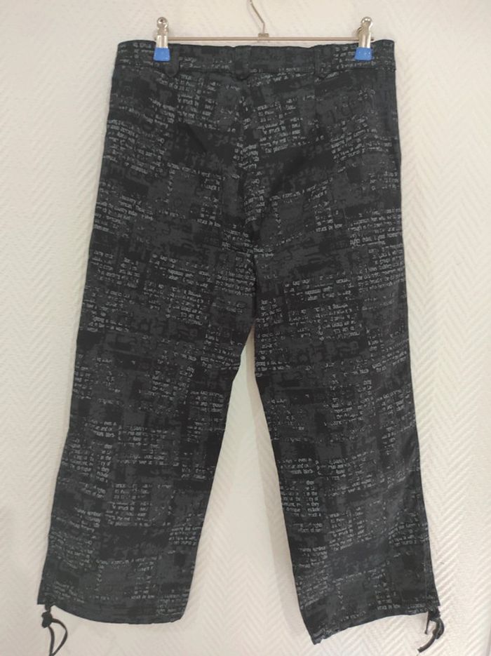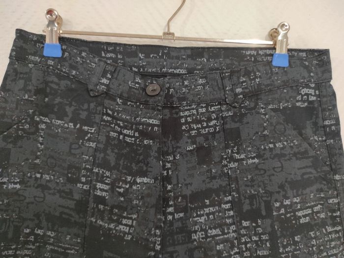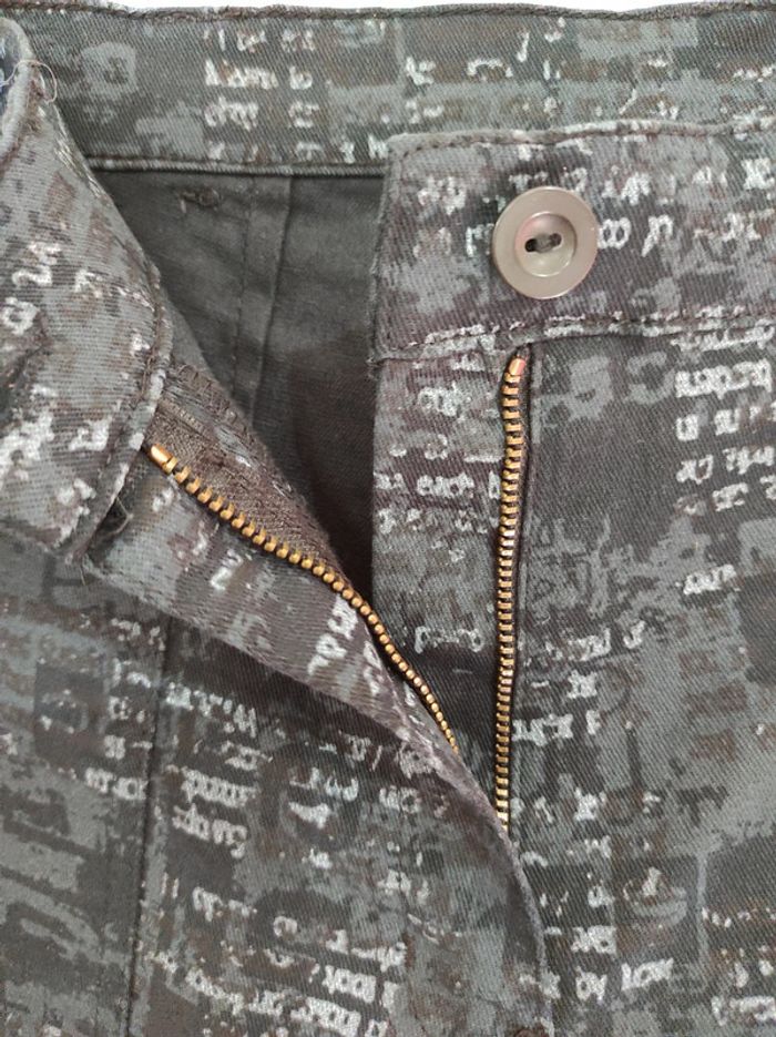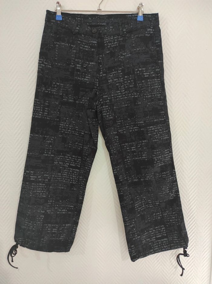 Pantacourt en jeans imprimés écritures dégradés de gris Neuf Laçage en bas des jambes Fermeture éclaire nickel avec bouton pour fermer. Présence de passants pour y glisser une ceinture au besoin Longueur totale 85 cm Longueur entrejambe/bas 56 cm #stitch7438_vêtements_femme_40/L #pantacourt40femme #pantacourt40