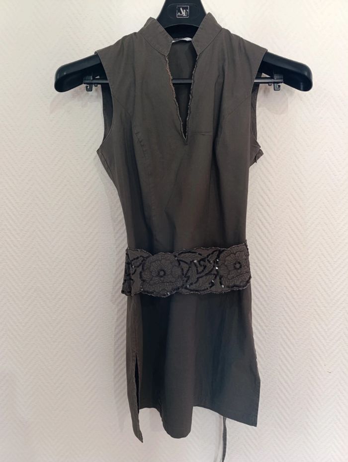 Tunique couleur kaki sans manches avec ceinture à nouer avec sequins. Bas échancré de chaque côté. Col V brodé fermeture éclair sur côté gauche Se porte près du corps Très bon état Retrouvez d'autres annonces ici: #stitch7438_vêtements_femme_38/M #tunique #tuniquefemme #tunique38 #tuniquefemme38 #promod38 #promodfemme38 #promodfemme