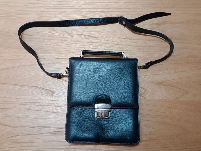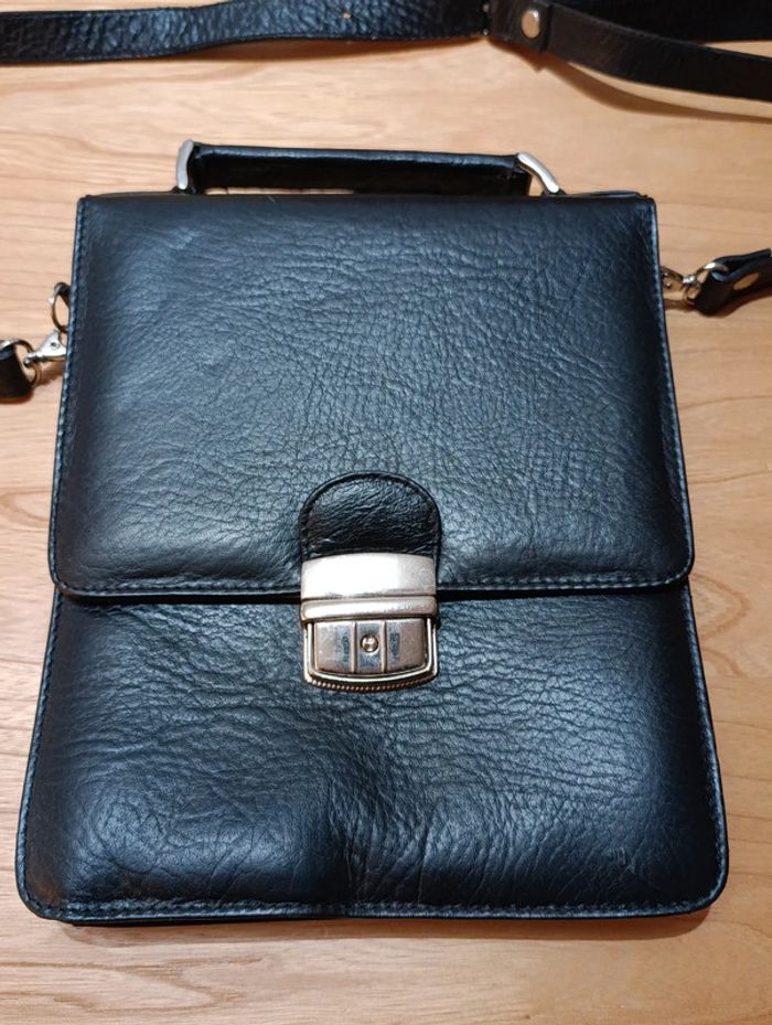 Sacoche bandoulière en cuir noir, poignée sur le dessus pour porter a la main. Comprenant 3 compartiments dont un avec fermeture éclaire. Petite pochette sur le devant. Fermeture sur le devant avec clip. Lanière réglable pour porter en bandoulière, possibilité de la retirer. Très bon état, un mini accro en bas (cf photo) Dimensions: 25 cm de haut, 21 large, 7,5 cm épaisseur #sacochehomme #sacochenoire #sacochecuirhomme #sacochecuir #sacochecuirnoir #sacochecuirnoirhomme