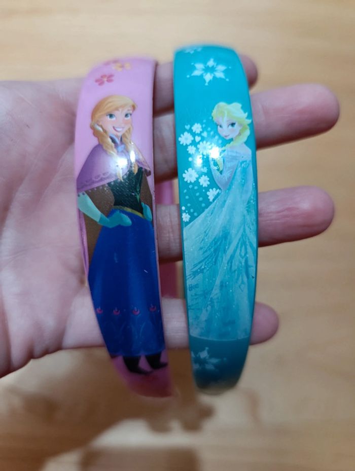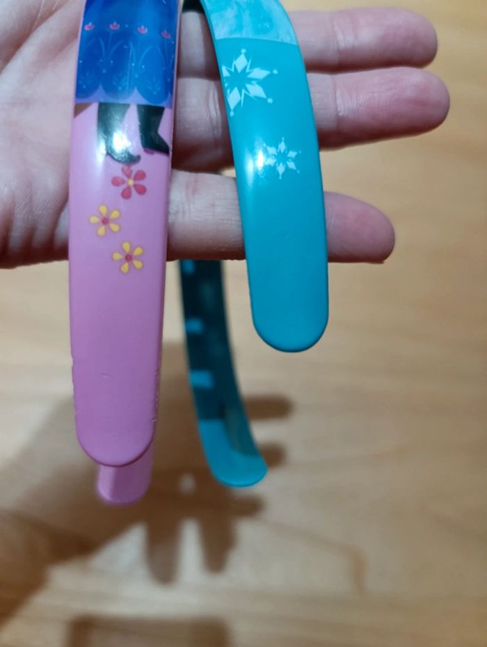 Lot de 2 serres têtes reine des neiges, modèle enfant, l'un rose, l'autre bleu. Le rose a été un peu mordillé
