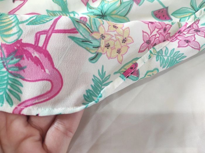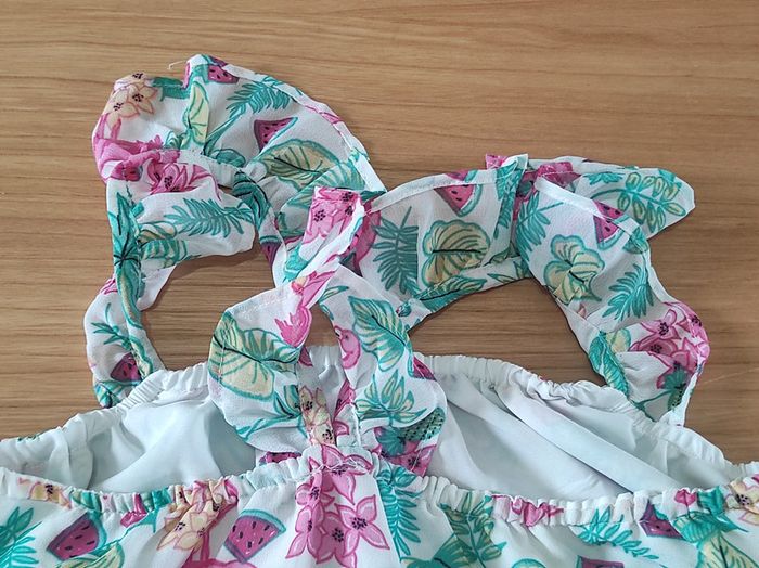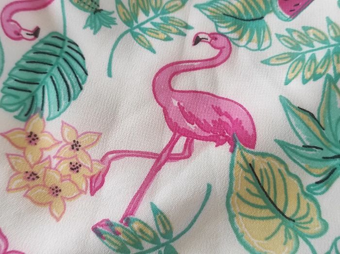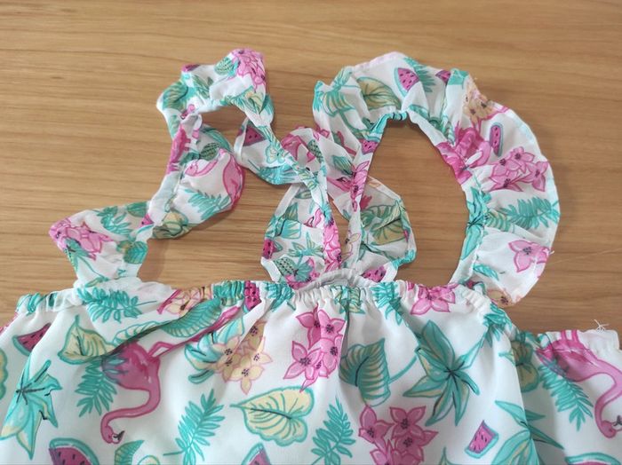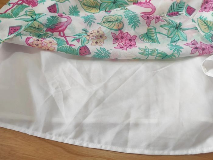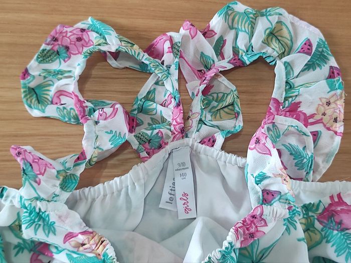 Magnifique haut avec flamand rose sur fond blanc avec feuillages vert et jaune. Bretelles ornés de froufrou qui se rejoignent dans le dos État neuf Taille 140 cm marque 9/10 ans Matière non précisé #stitch7438_fille_10ans