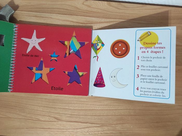 Livre a spirales avec couvertures et pages cartonnées. Exemple de motif avec formes prédécoupées pour reproduire l'image ou laisser libre cours a son imagination #stitch7438_livres_enfants #livreenfant #livrepochoirs #pochoirs