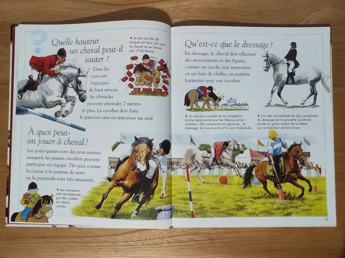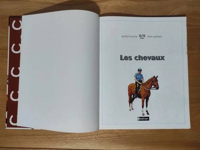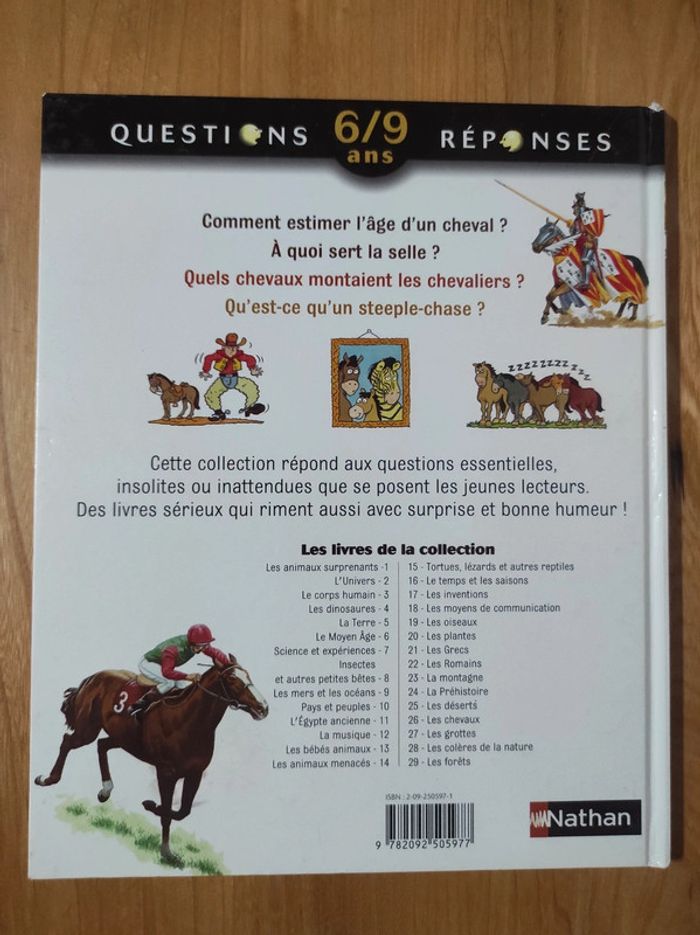 Comment estimer l'âge d'un cheval? A quoi sert la selle? Quels chevaux montaient les chevaliers? Qu'est ce qu'un steeple-chase? Collection qui répond aux questions essentielles, insolites ou inattendues que se posent les jeunes lecteurs. Couverture cartonnée Pages papier glacé Très bon état, très léger accrochage sur le haut de la tranche (voir photo) #stitch7438_livres_enfants #questionsreponses #leschevaux #chevaux #livreenfant