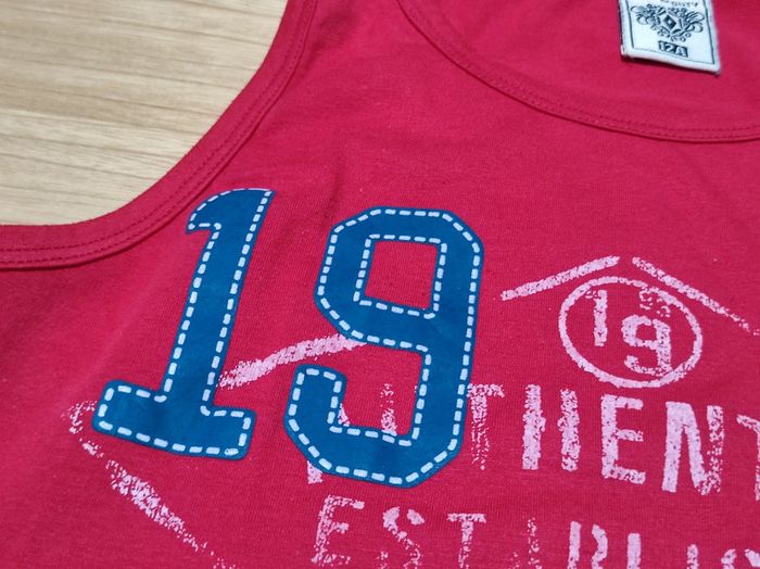 Débardeur rouge avec inscriptions blanche et bleue. Bon état général inscription blanche qui s'estompe un peu Couleur conforme à la 1re photo #stitch7438_garçon_12ans