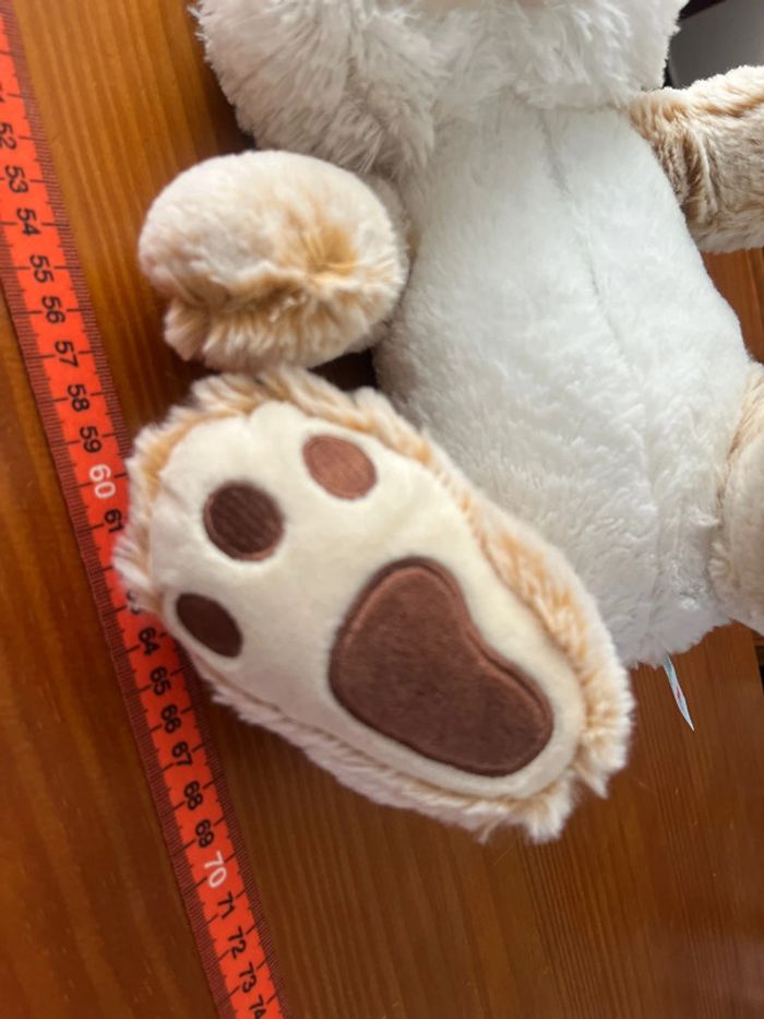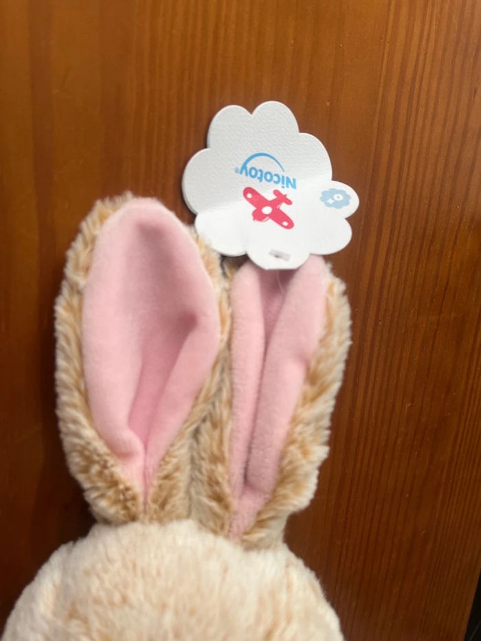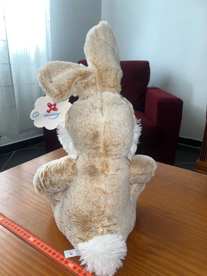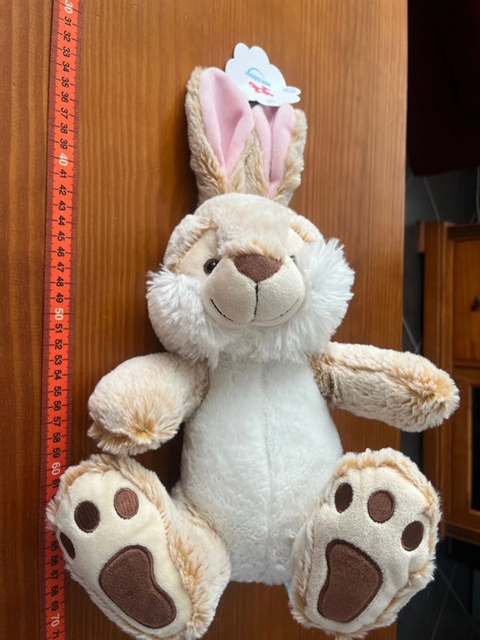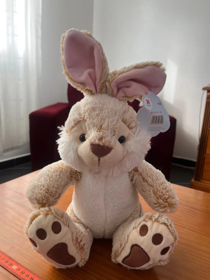 Prix non négociable pour l’instant merci article neuf encore avec étiquette très belle peluche lapin doudou assis fausse fourrure blanc marron clair empreintes au niveau des pattes intérieur oreille rose. Les yeux sont en plastique couleur noir et marron. Le nez marron. Petite queue blanche marque Nicotoy Simba Toys