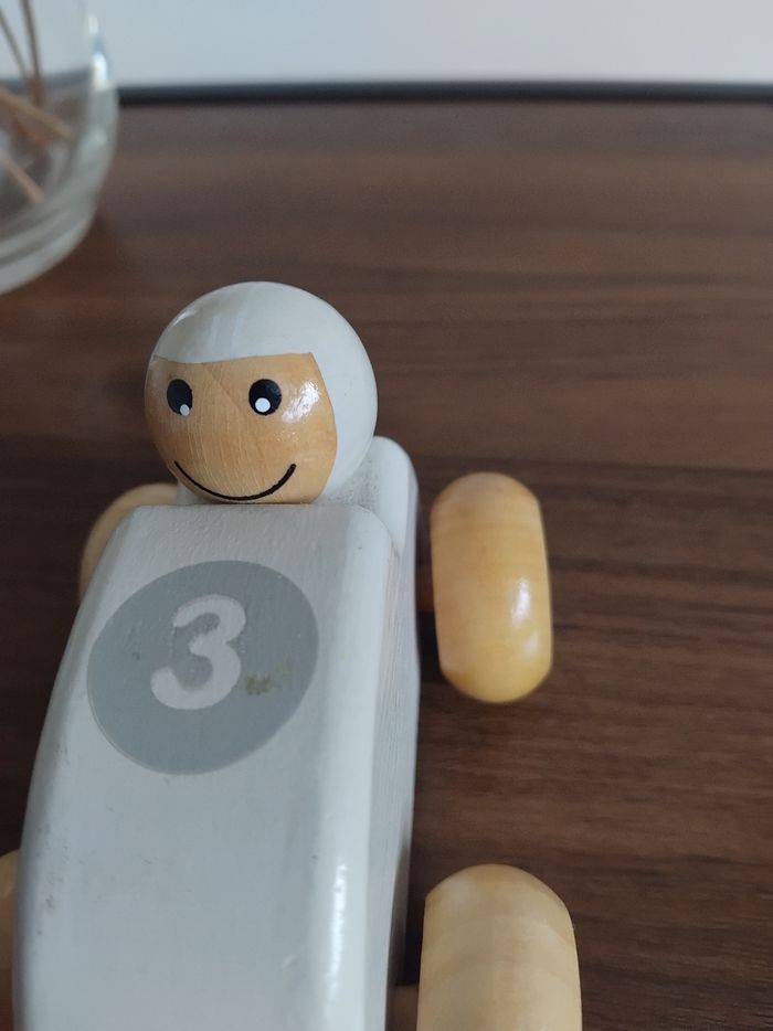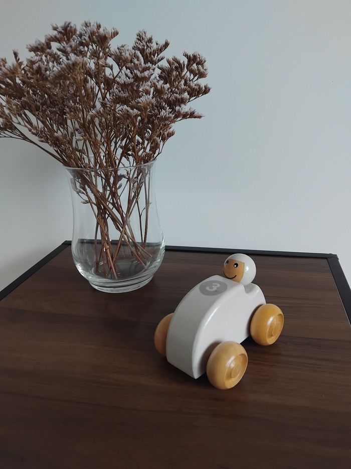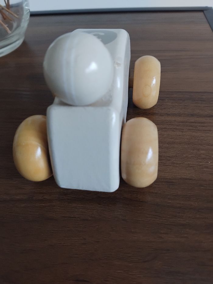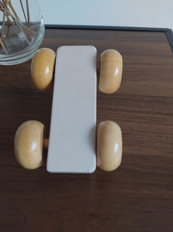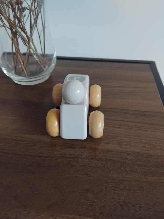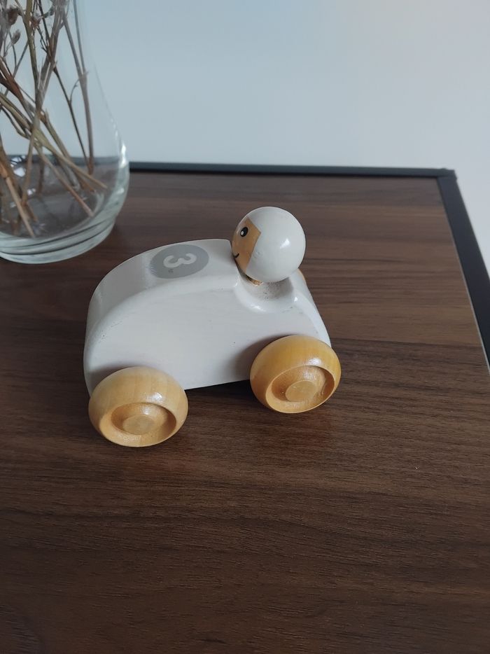 Voiture en bois pour enfant. De couleur blanc et crème. Petite inscription chiffre 3. Roule très bien. #joueteducatifnade3033 #jouetenfantnade3033