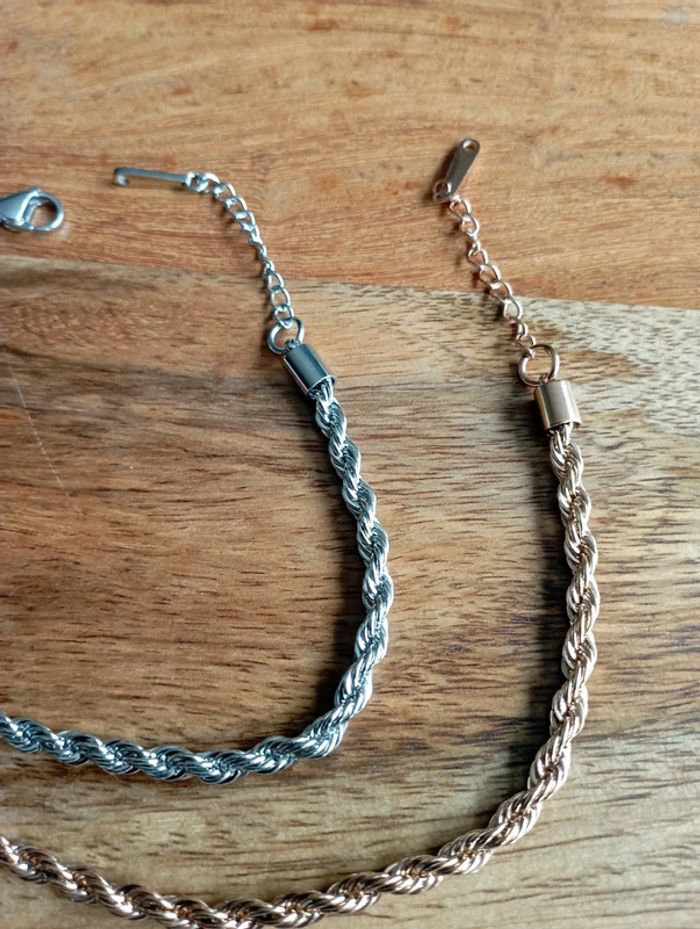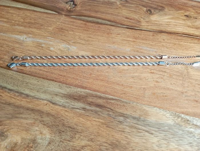 Lot de 2 bracelets de cheville acier doré et argenté, longueur 24,5 cm, peuvent être vendus séparément pour 3 € l'un