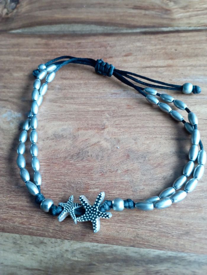 Bracelet de cheville avec lien noir et métal argenté, réglable par système de noeud coulissant