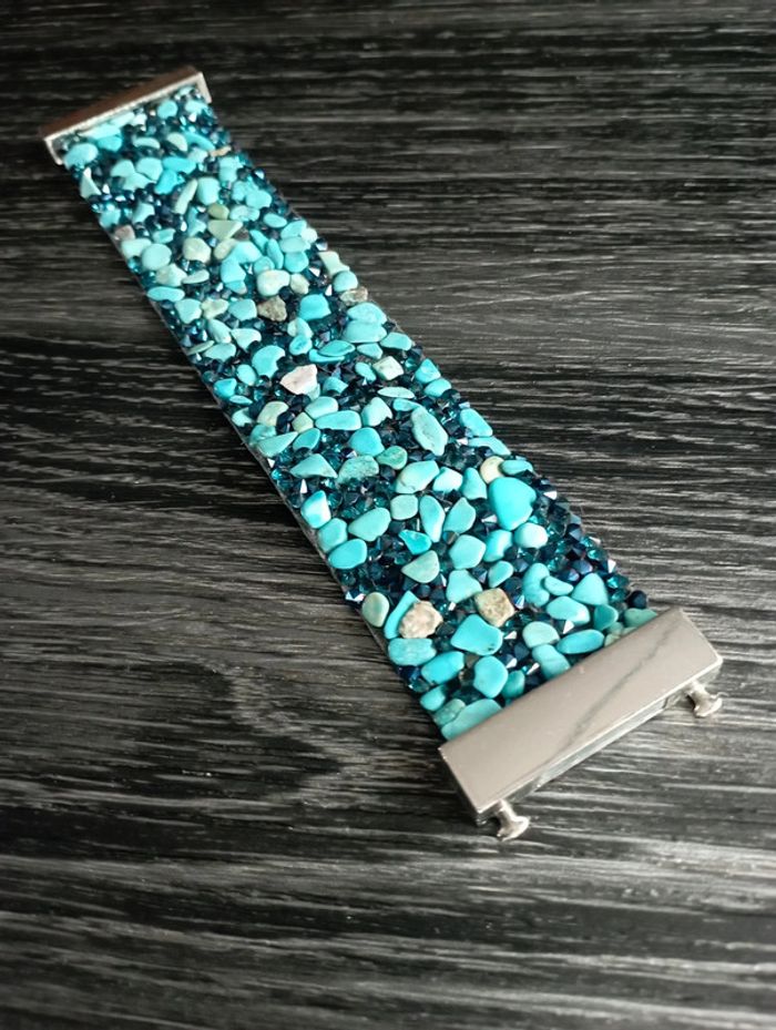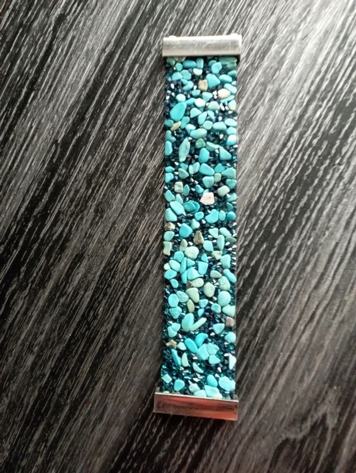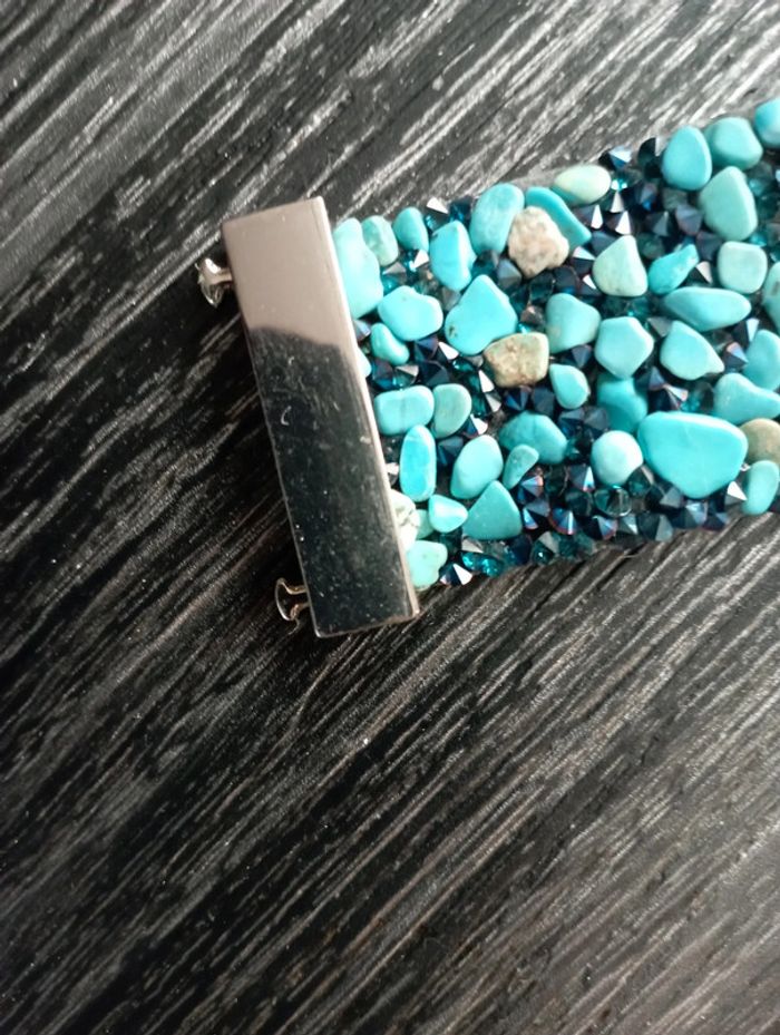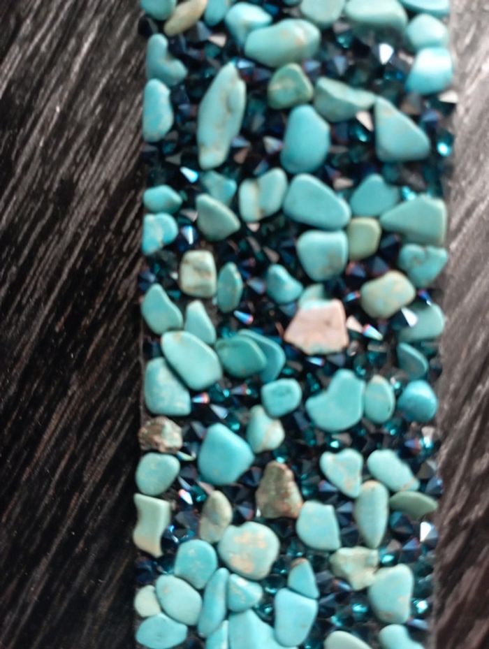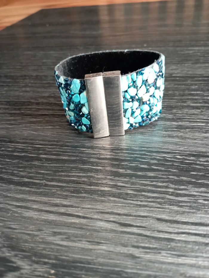 Bracelet manchette recouvert de petites pierres turquoise, blanches et bleues foncé, très élégant et original, dessous velours noir, fermeture magnétique métal argenté, longueur totale 18 cm x 3,5 cm largeur