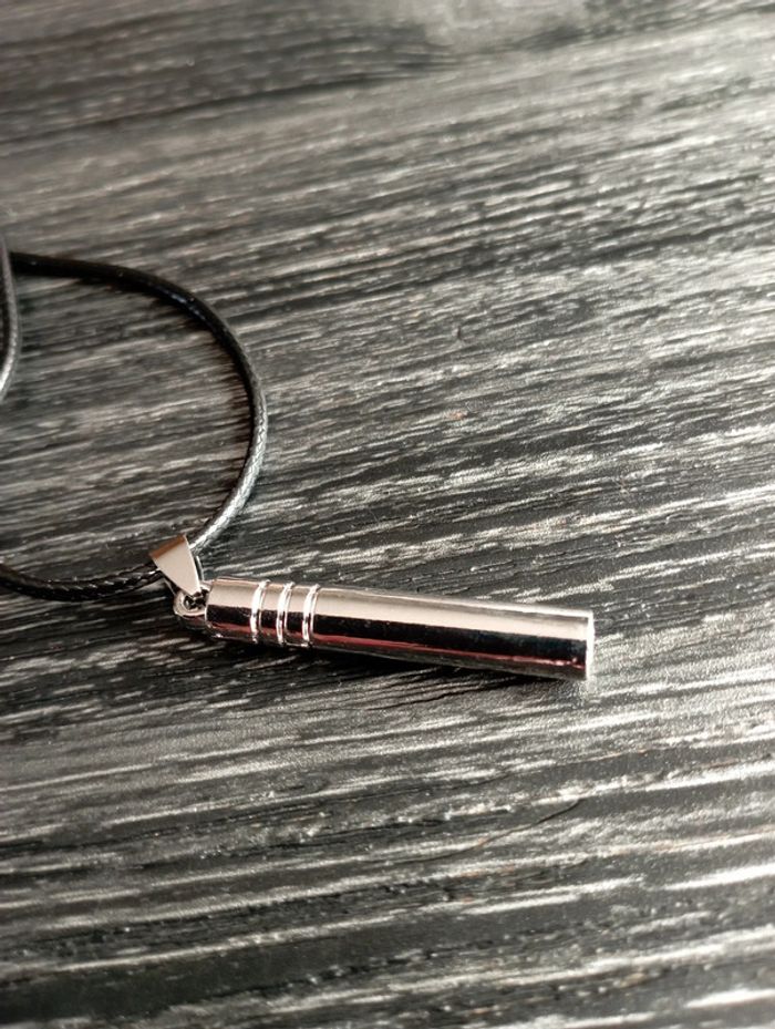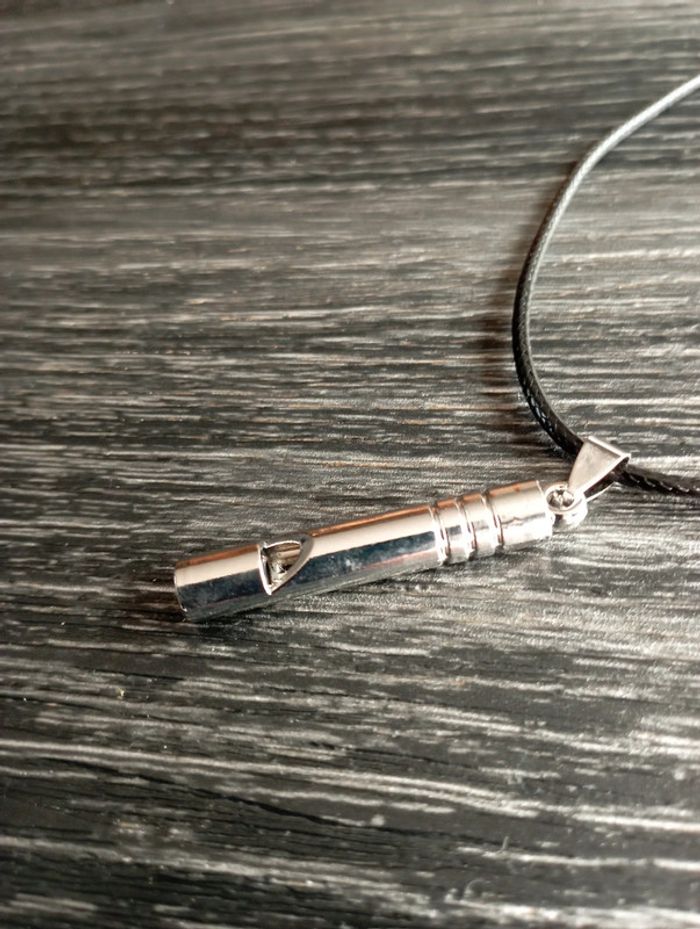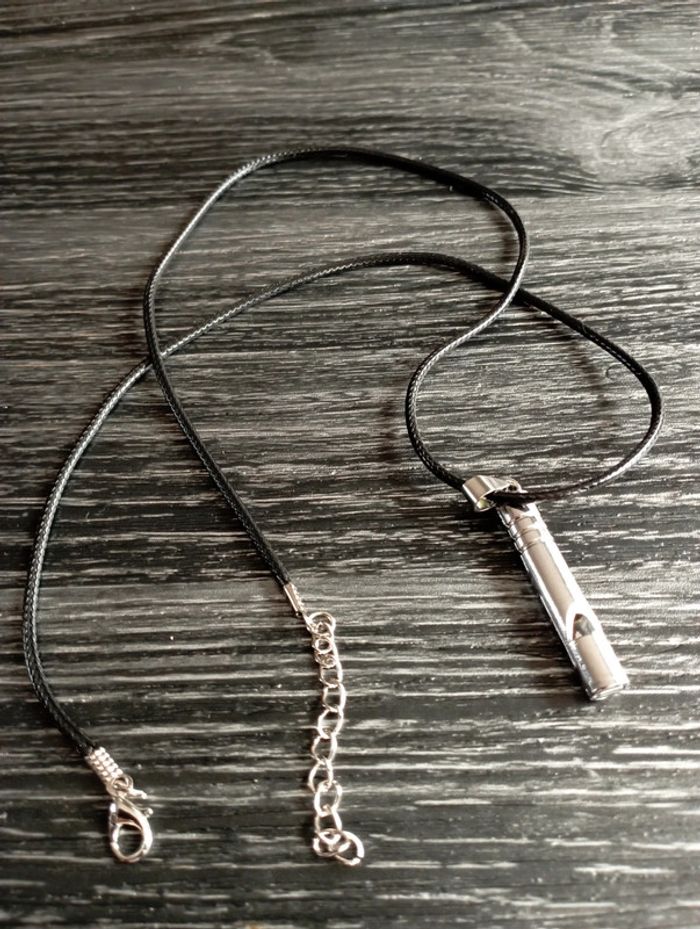 Sifflet en titane argenté avec cordon simili cuir noir, attache en métal argenté, longueur totale sifflet 4,5 cm x 0,5 cm de large, longueur totale du cordon 65 cm, léger et résistant à la corrosion, élégant et discret à porter, peut servir en cas d'urgence (son aigu)