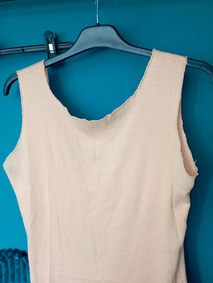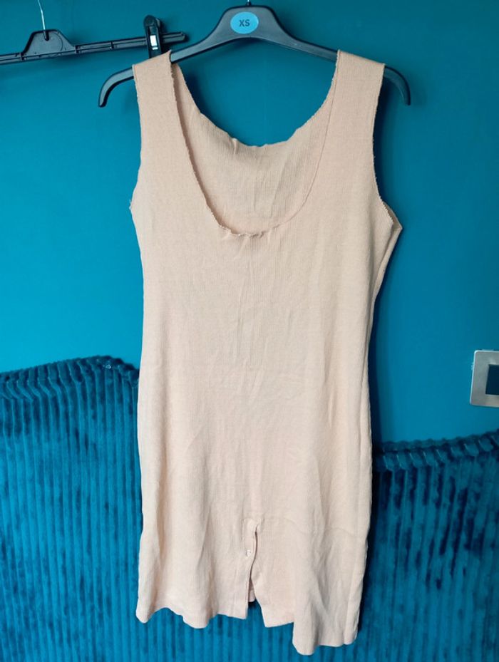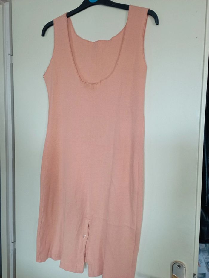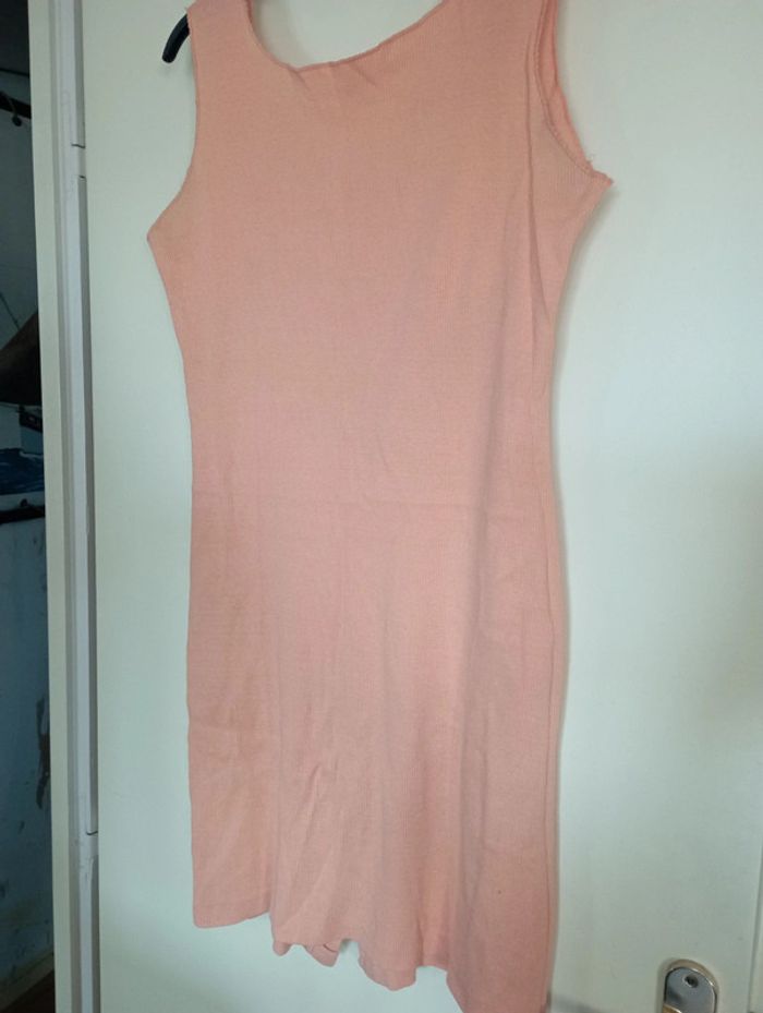 Robe d'été en maille coton couleur abricot, un peu plus lumineuse que sur les photos, décolleté profond au dos et fente avec pressions à la base, sans manche, très agréable à porter par fortes chaleurs, un peu froissée mais elle sera repassée avant l'envoi, largeur aisselles 44 cm, longueur 90 cm