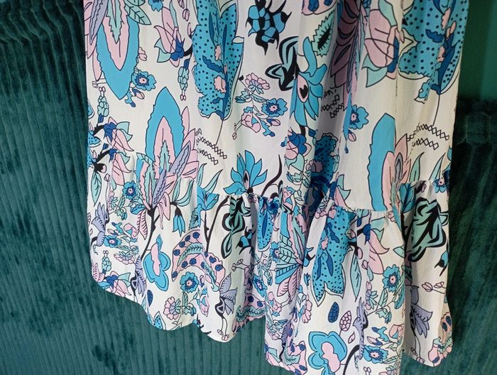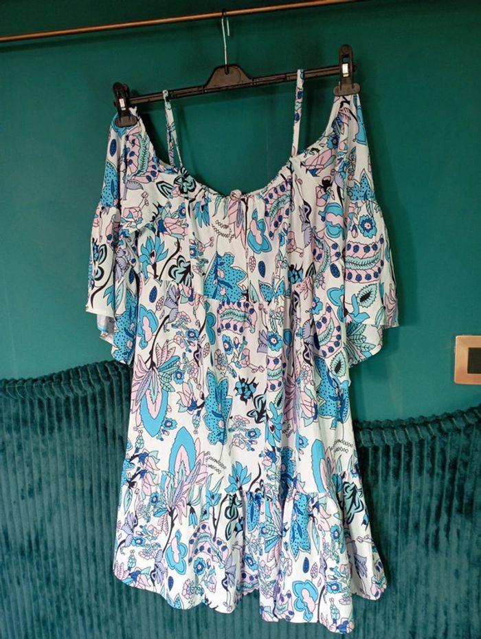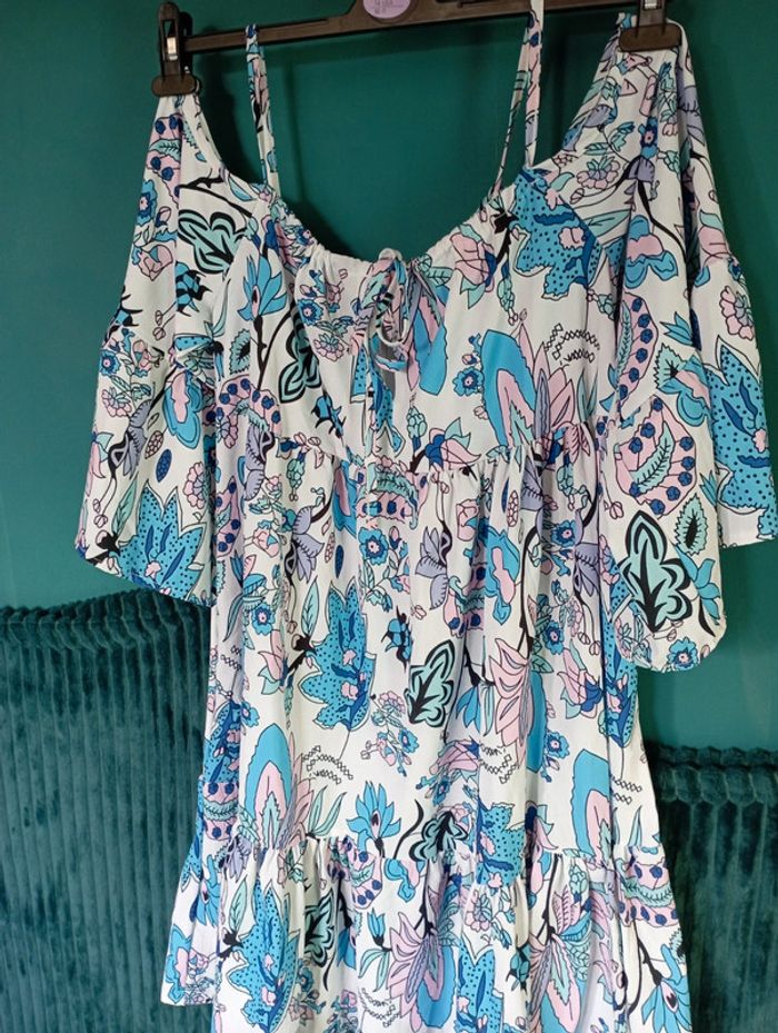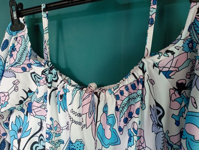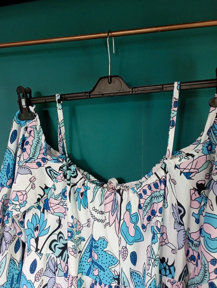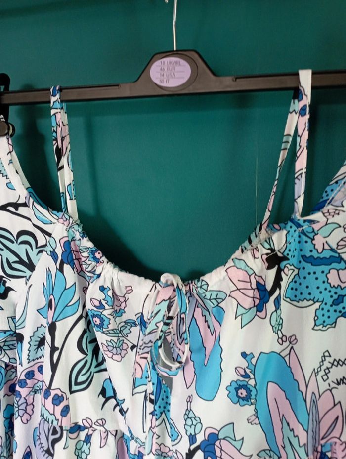 Robe d'été à fines bretelles et manches mi longues, lien coulissant au décolleté permettant de régler la longueur des bretelles et de froncer le décolleté, évasée à partir de la poitrine, largeur aisselles 50 cm, longueur 90 cm