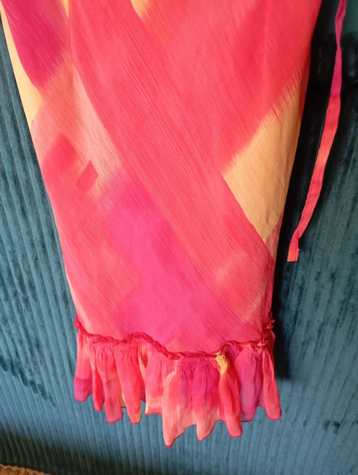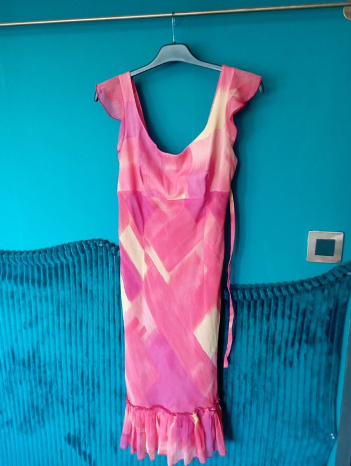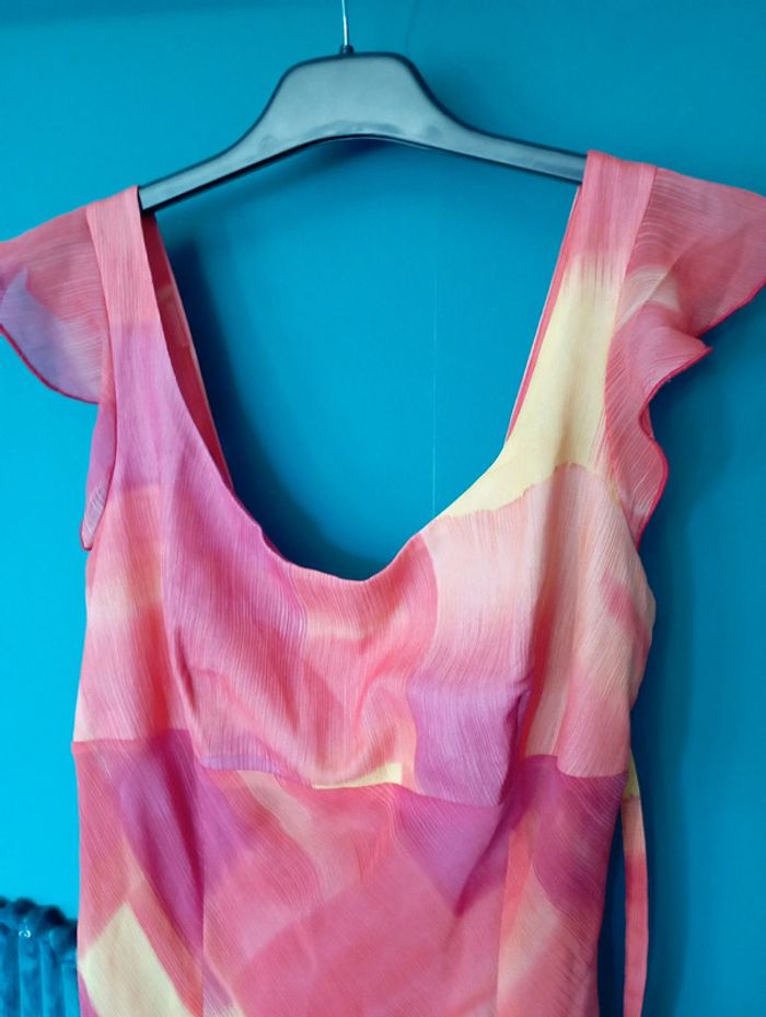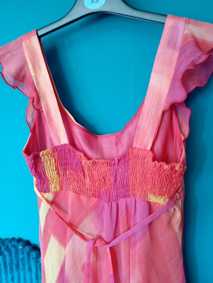 Robe d'été tissu fluide, à bretelles avec petit volant, dos smocké avec lien à nouer au dos, volant à la base, largeur aisselles 44 cm pouvant se tendre, longueur 107 cm