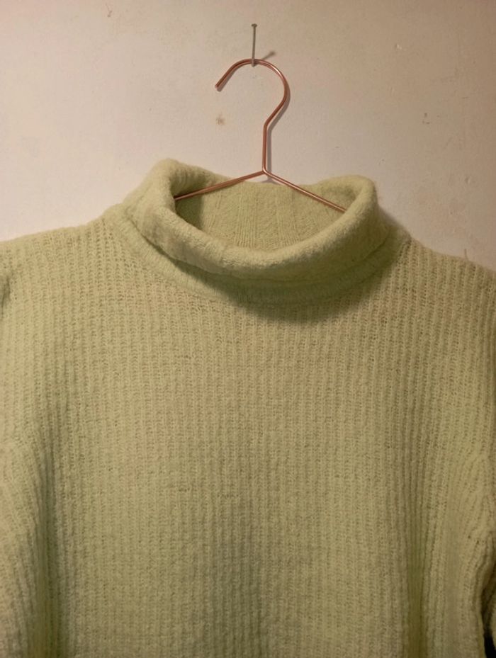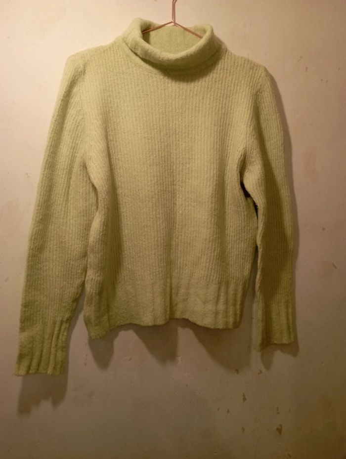 Pull col roulé en laine douce vert anis, confortable, largeur aisselles 49 cm, longueur totale 58 cm. N'hésitez pas à consulter mes autres articles je fais un grand tri 😉