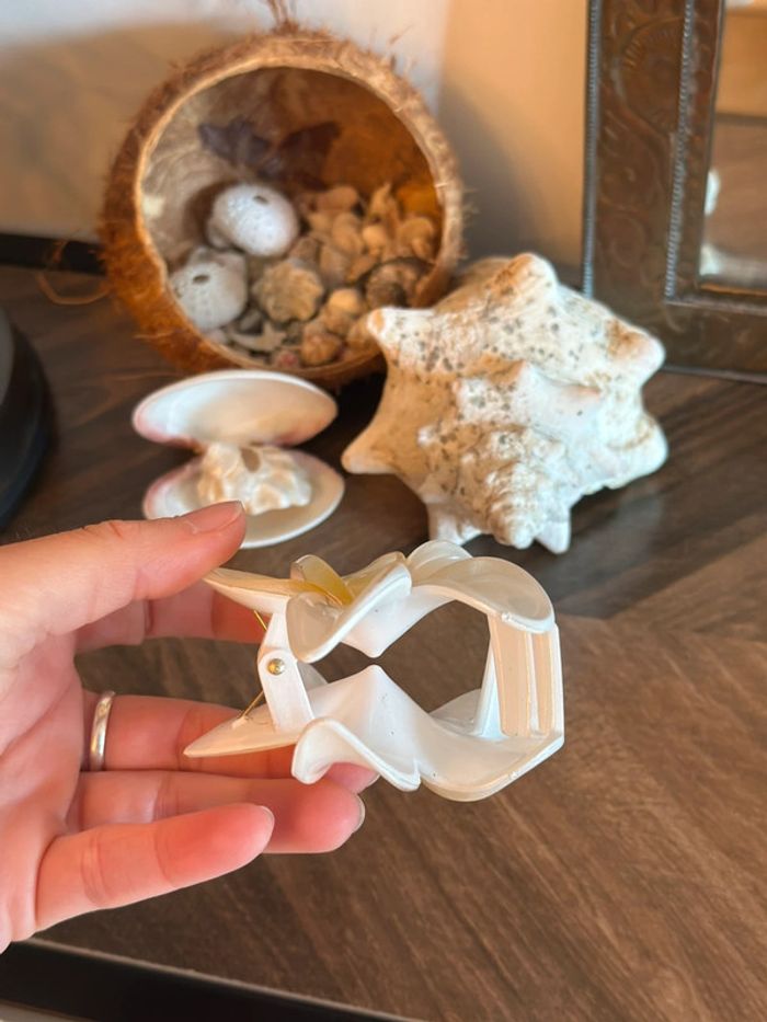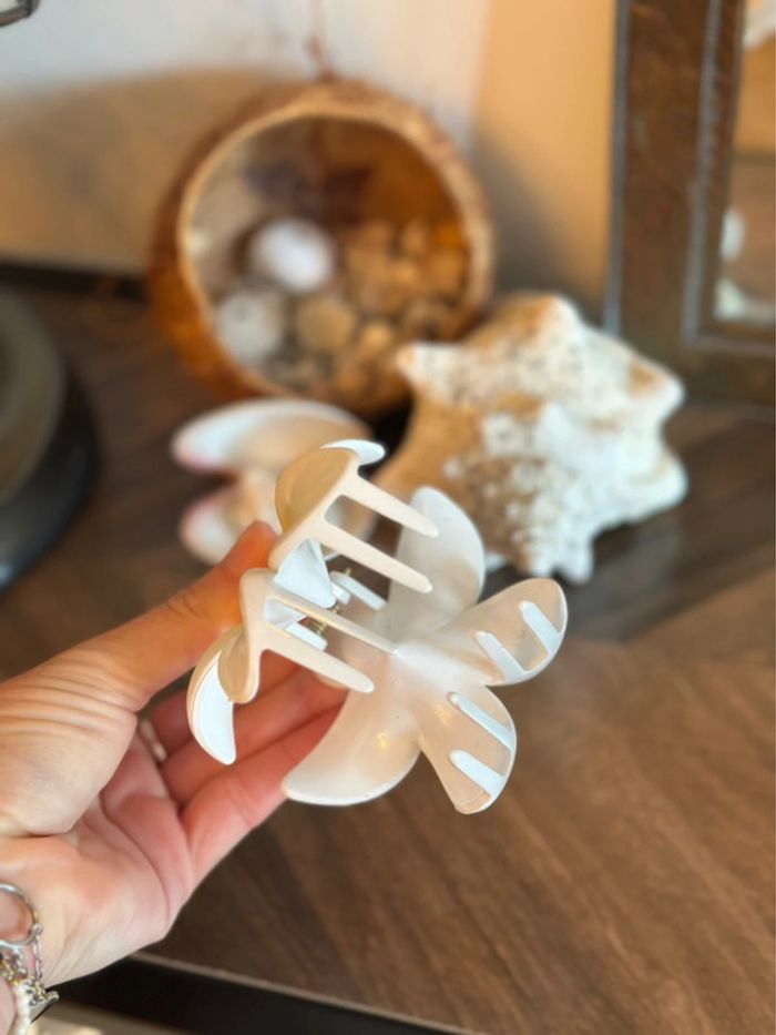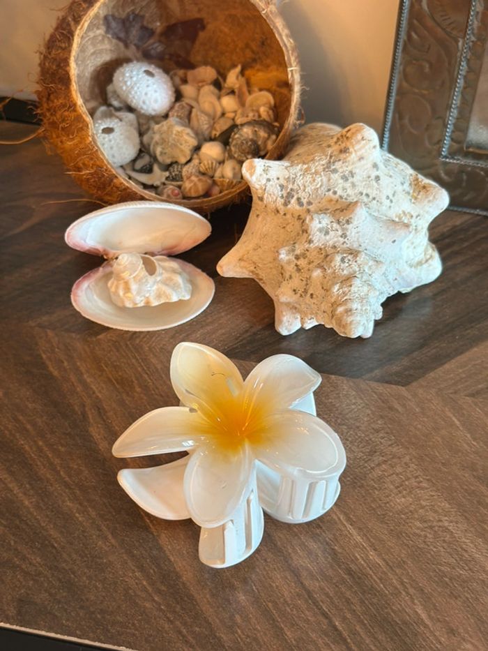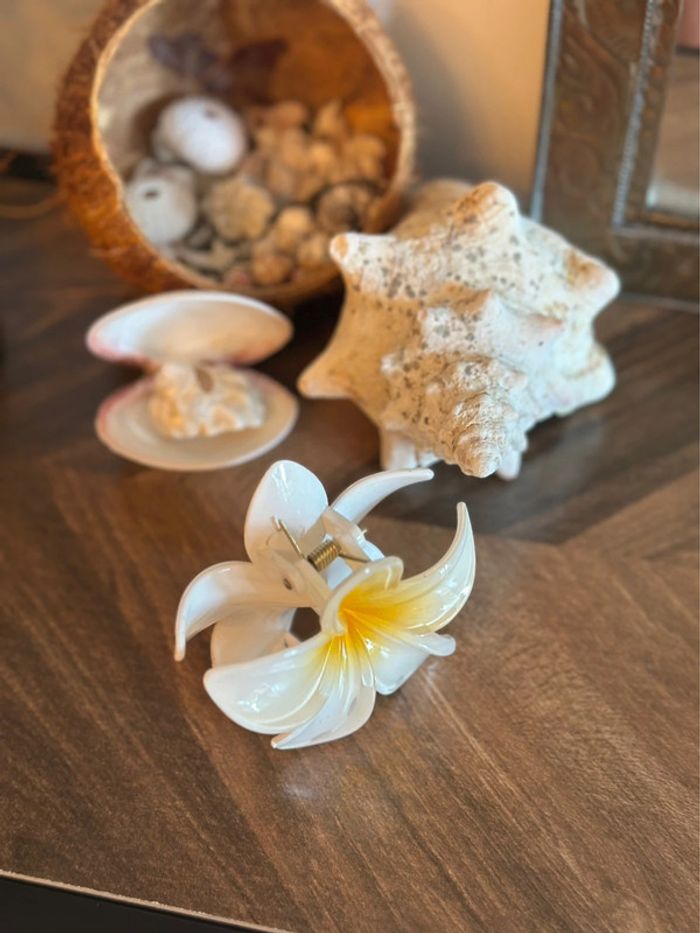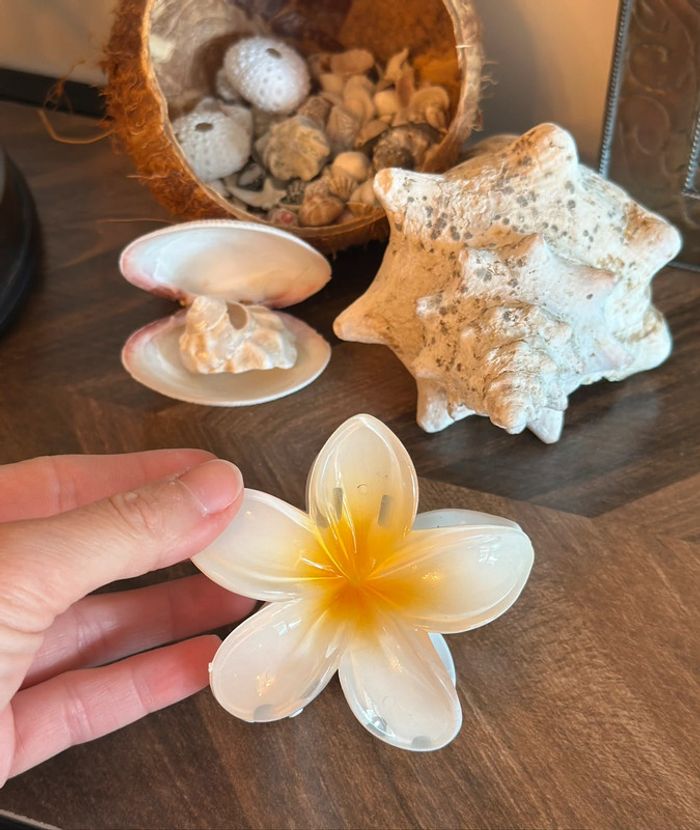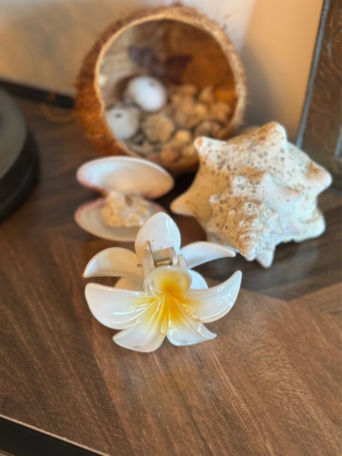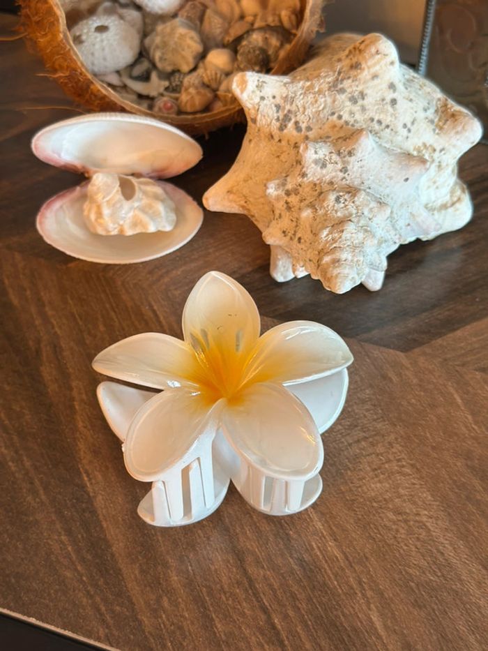 Pince à cheveux en forme de fleur de Tahiti, dans des tons délicats de blanc et jaune, effet légèrement nacré. Un accessoire parfait pour ajouter une touche exotique et féminine à vos coiffures. 🌼