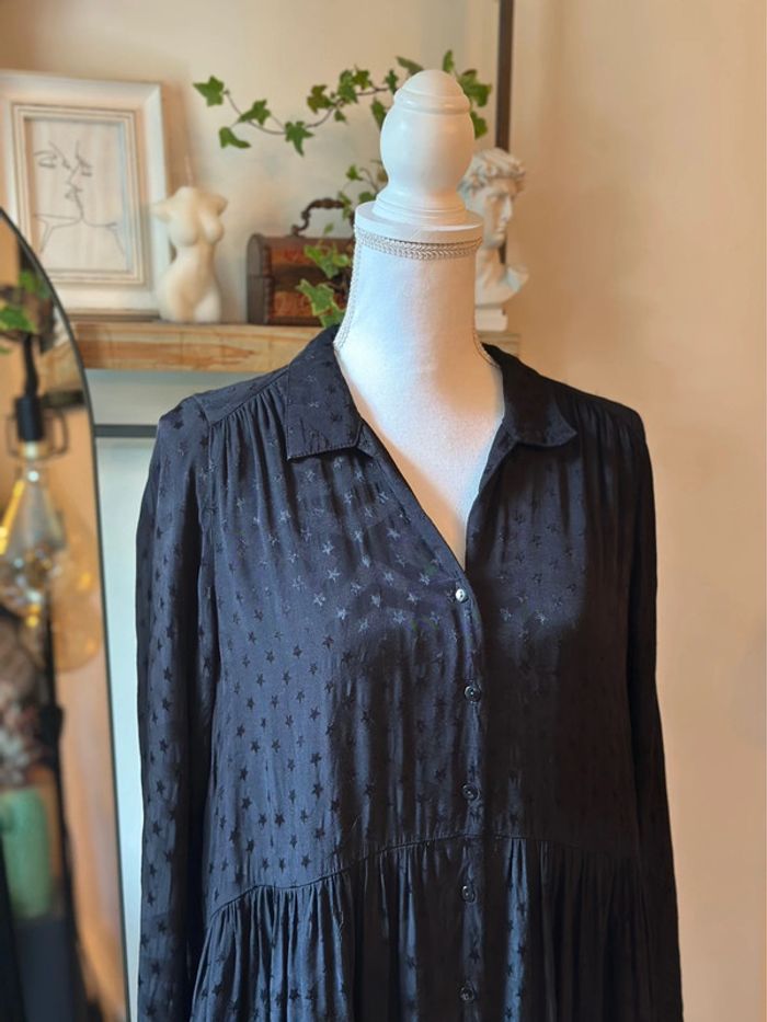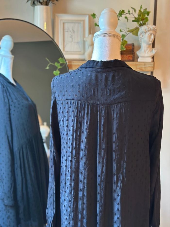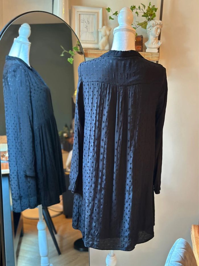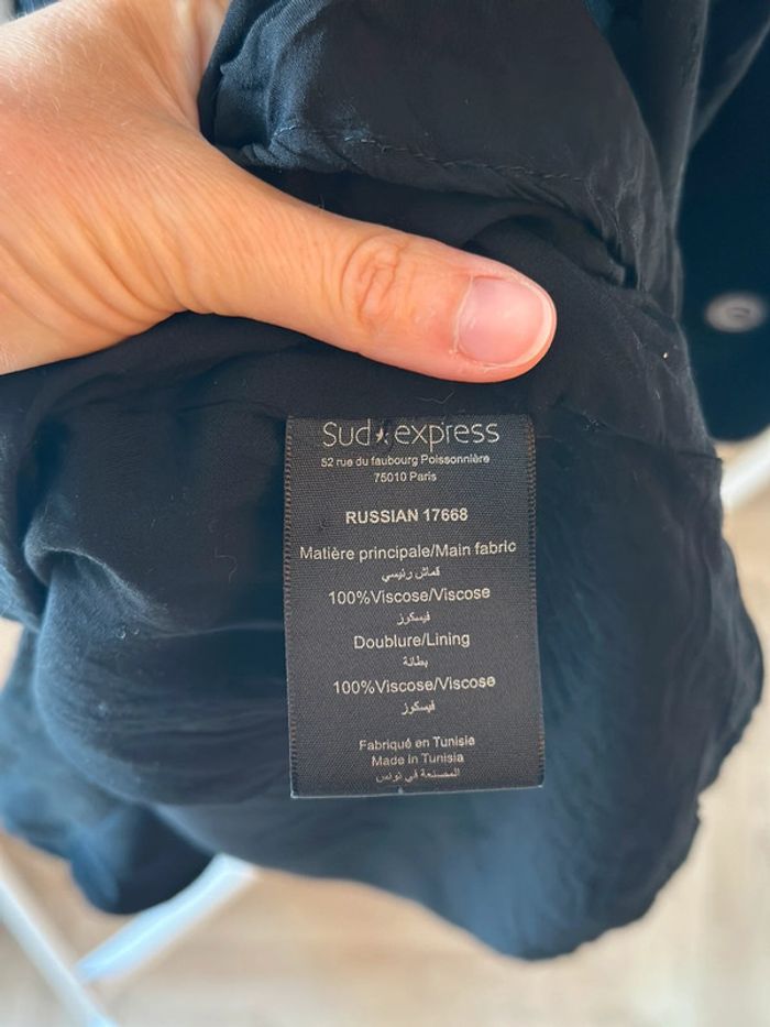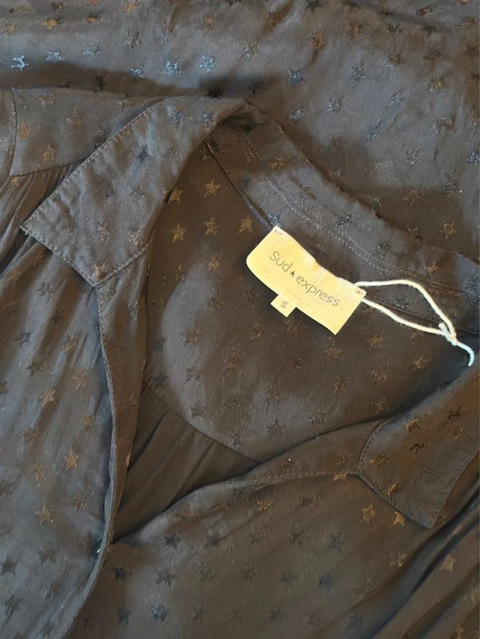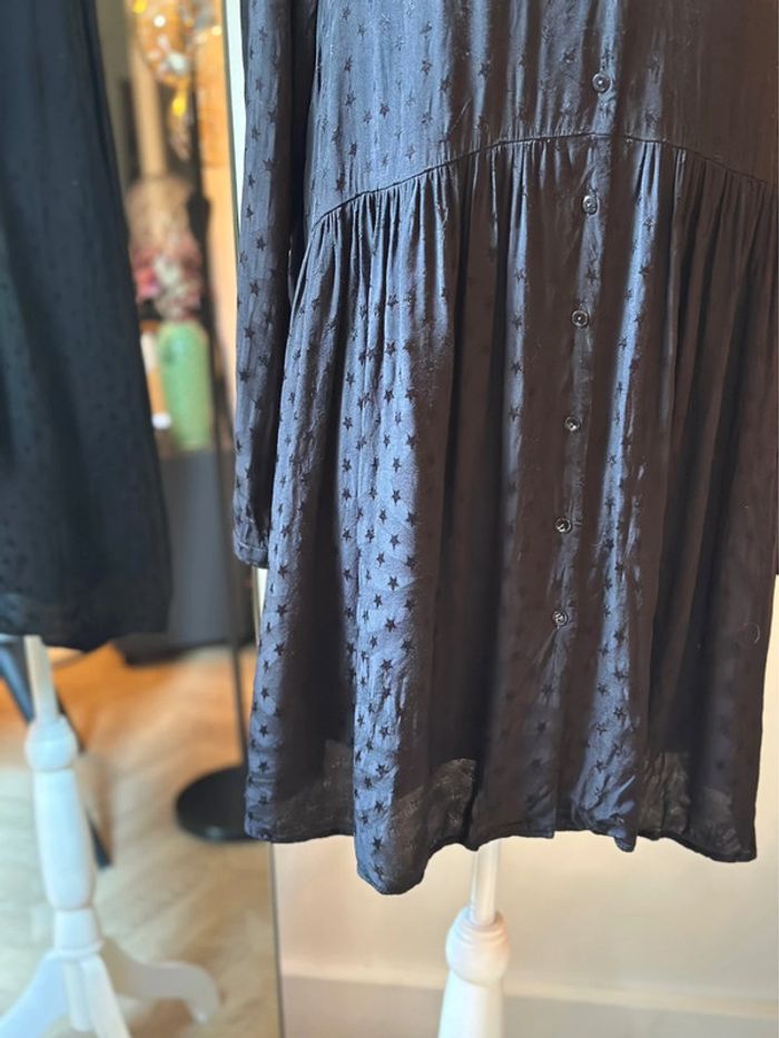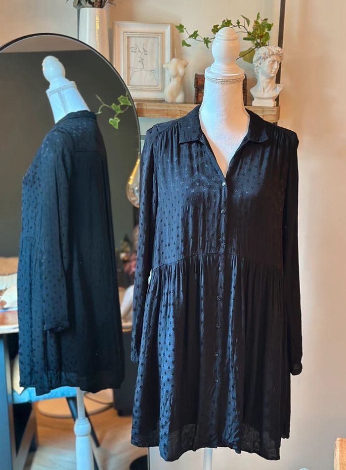 Adorable robe noire signée Sud Express, modèle Russian, en viscose 100 % ultra légère. Doublée pour plus de confort, elle est fluide, agréable à porter et en excellent état. ⭐ Petits motifs étoiles ton sur ton pour une touche subtile et raffinée, parfaite de jour comme de soir. Coupe babydoll ample et confortable, avec col chemise et boutonnage intégral. 📏 Taille 36 – coupe flatteuse, idéale pour un look féminin et moderne. À porter avec des boots, des sandales ou même des baskets selon l’humeur 🖤 100 % viscose (doublure incluse) Fabriquée en Tunisie.