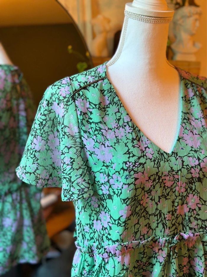 Blouse à imprimé fleuri vert et rose de la marque Andy & Lucy, coupe légèrement évasée, manches courtes et col en V. Joli détail dans le dos avec ouverture boutonnée et bordure volantée. Tissu fluide 100 % polyester, agréable à porter au quotidien pour un style casual et féminin. Très bon état, pas de défaut. ℹ️ Photo portée générée à titre illustratif, pour vous donner une idée du rendu.