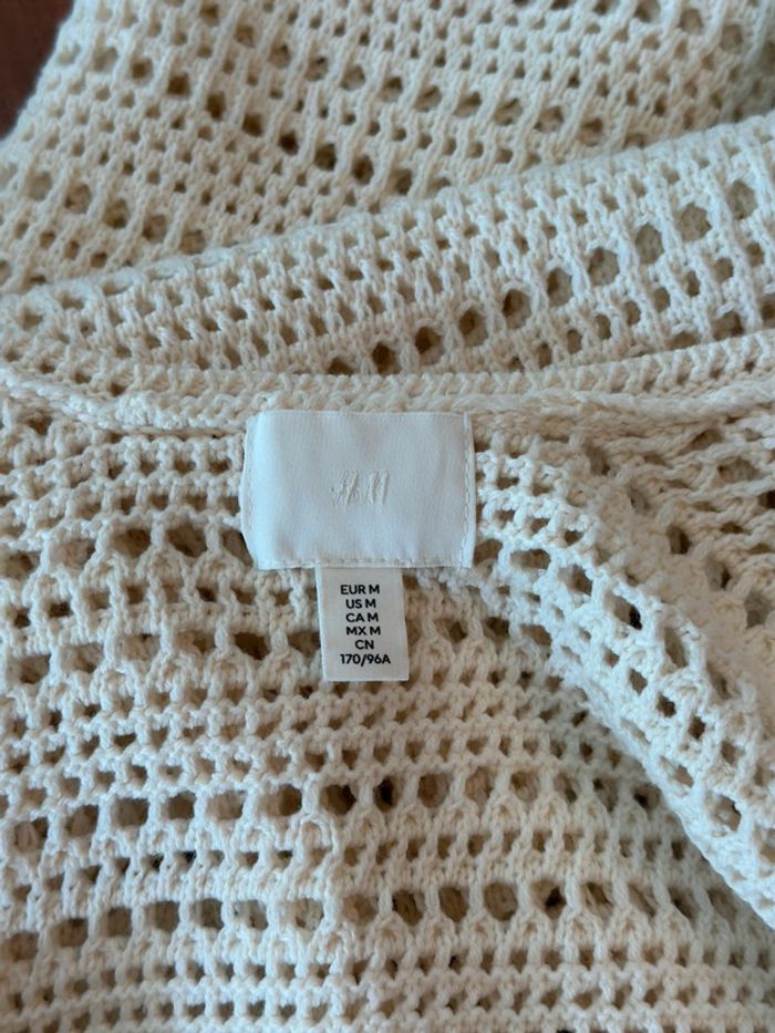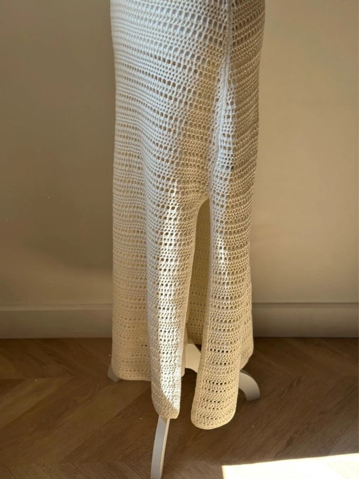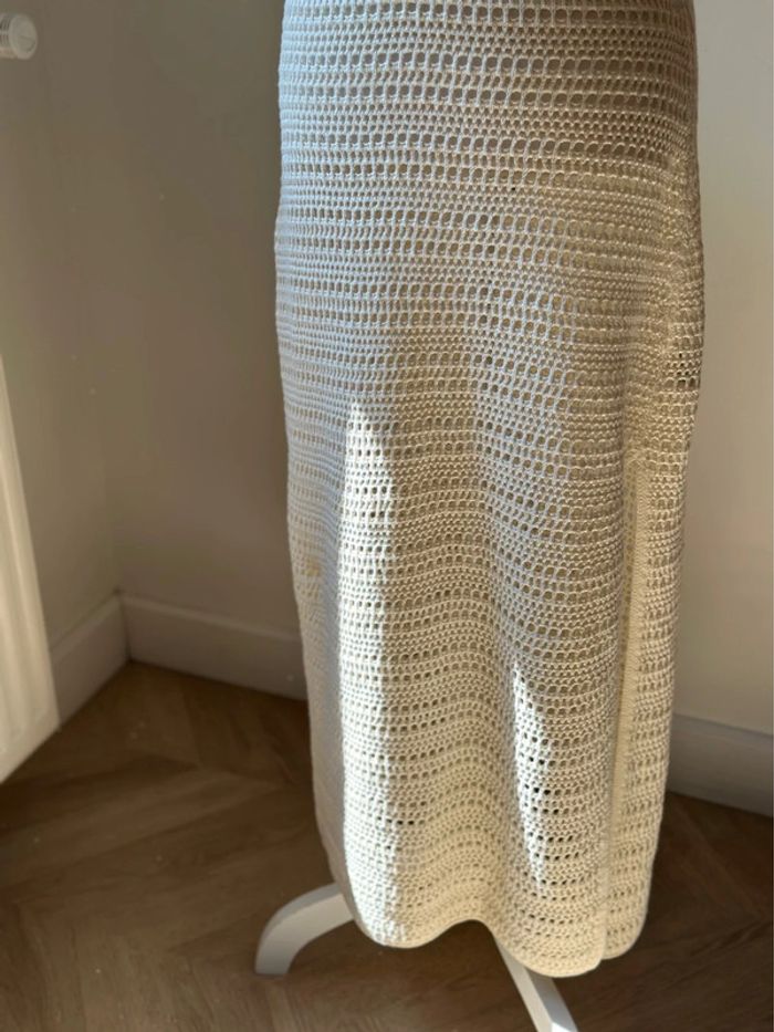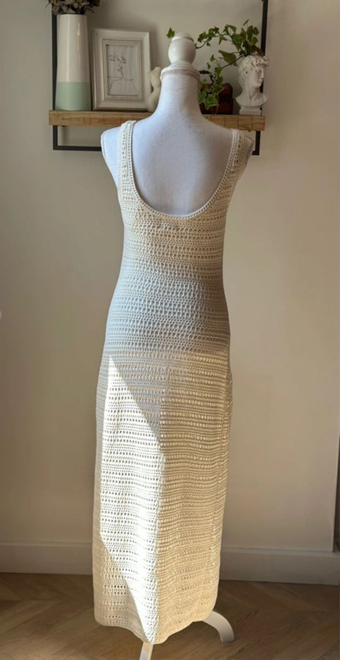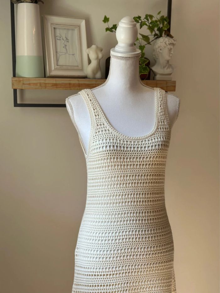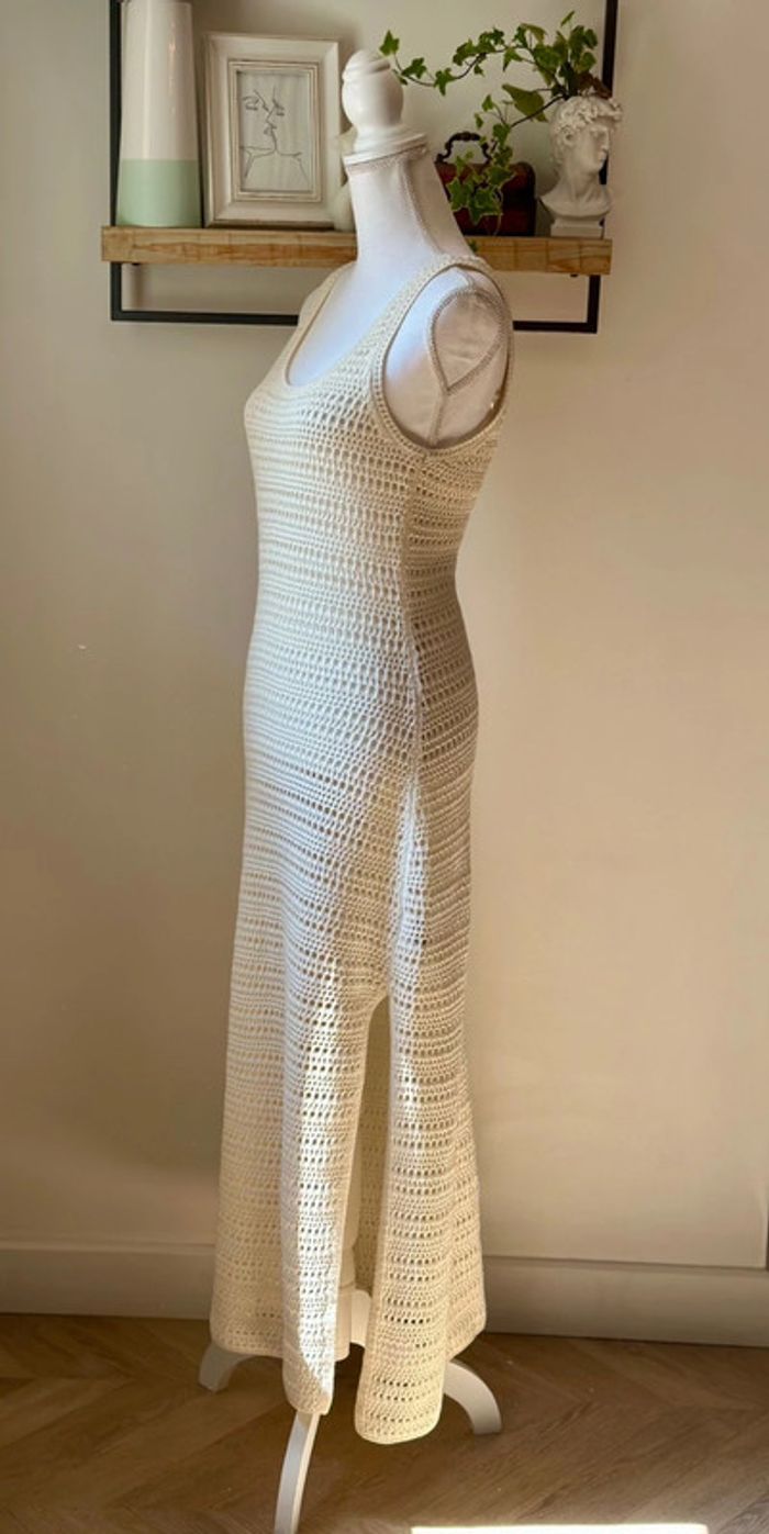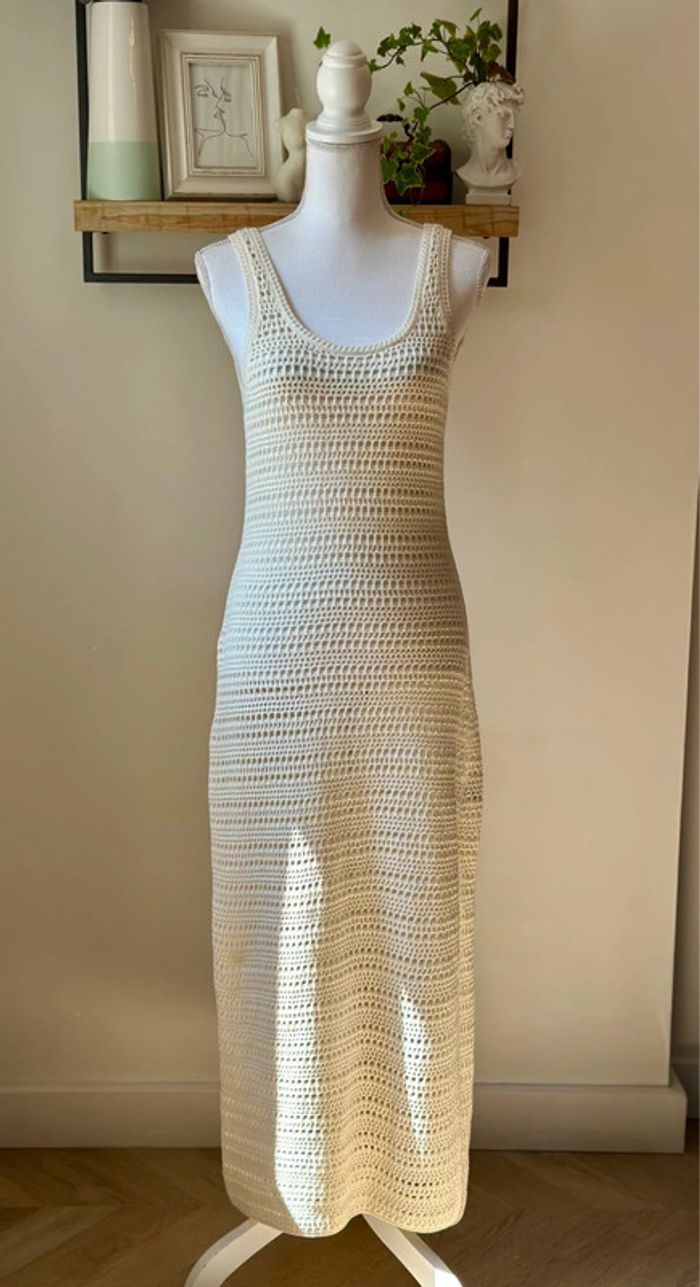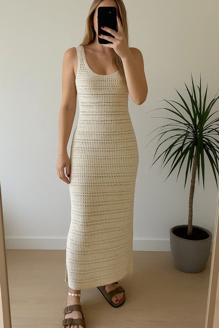 Robe longue d’été collection actuelle, sans manches en maille ajourée façon crochet, coupe ajustée, encolure ronde plongeante et larges bretelles. Matière douce en coton mélangé (60 % coton dont 20 % recyclé, 40 % acrylique), non doublée, avec une fente discrète sur le côté. Style casual chic parfait pour l’été, à porter en ville ou en bord de mer. Neuve sans étiquette. Prix d’achat neuf : 39,99€.