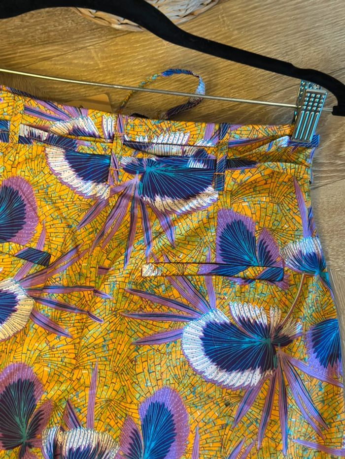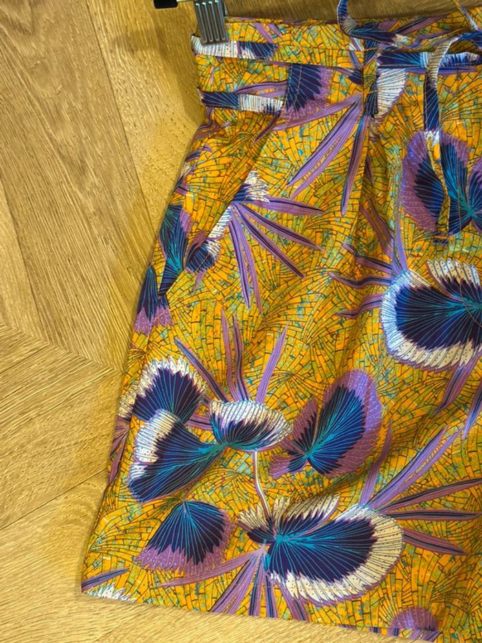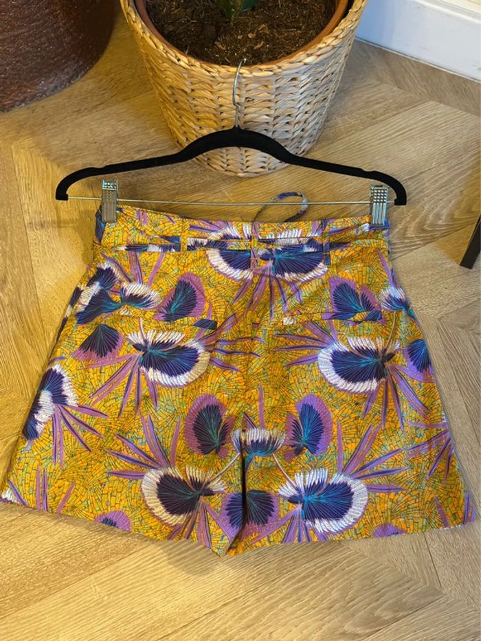 Short d’été en toile 100 % coton, imprimé all over dans des tons orangés et lilas. Taille haute avec deux plis creux à l’avant, passants et ruban amovible à nouer. Fermeture zippée discrète sur le devant, deux poches en biais. Doublé, léger et agréable à porter. Neuf avec étiquette, taille 36 qui taille normalement (longueur 40 cm). ℹ️ Photo portée générée à titre illustratif, pour vous donner une idée du rendu.
