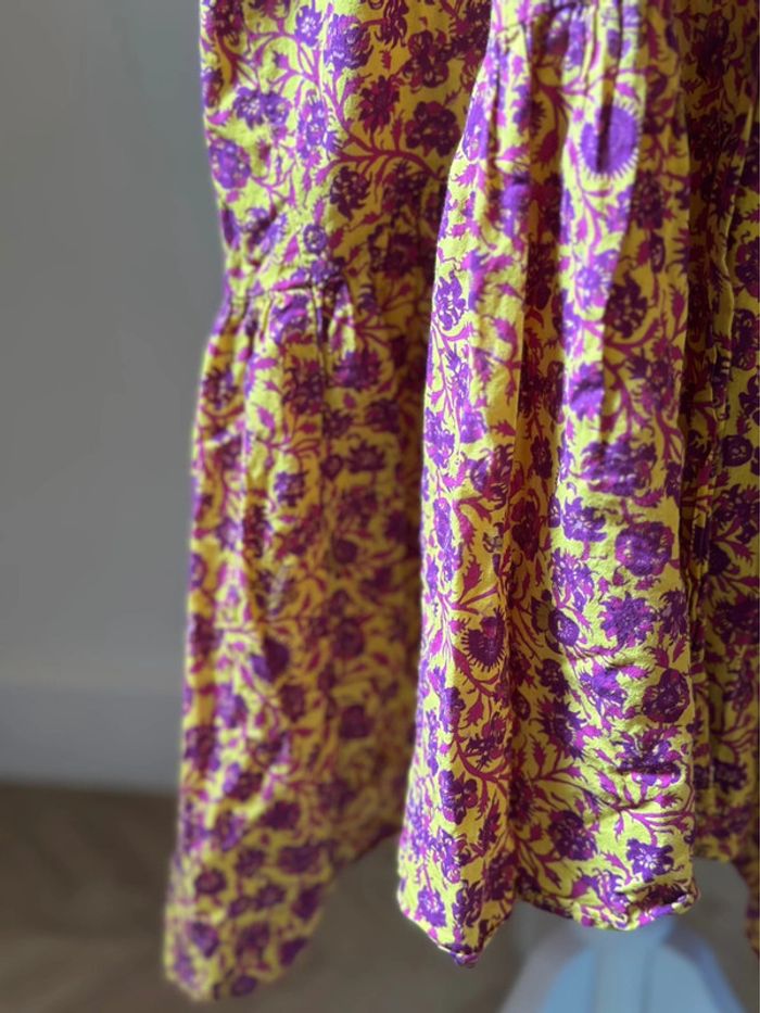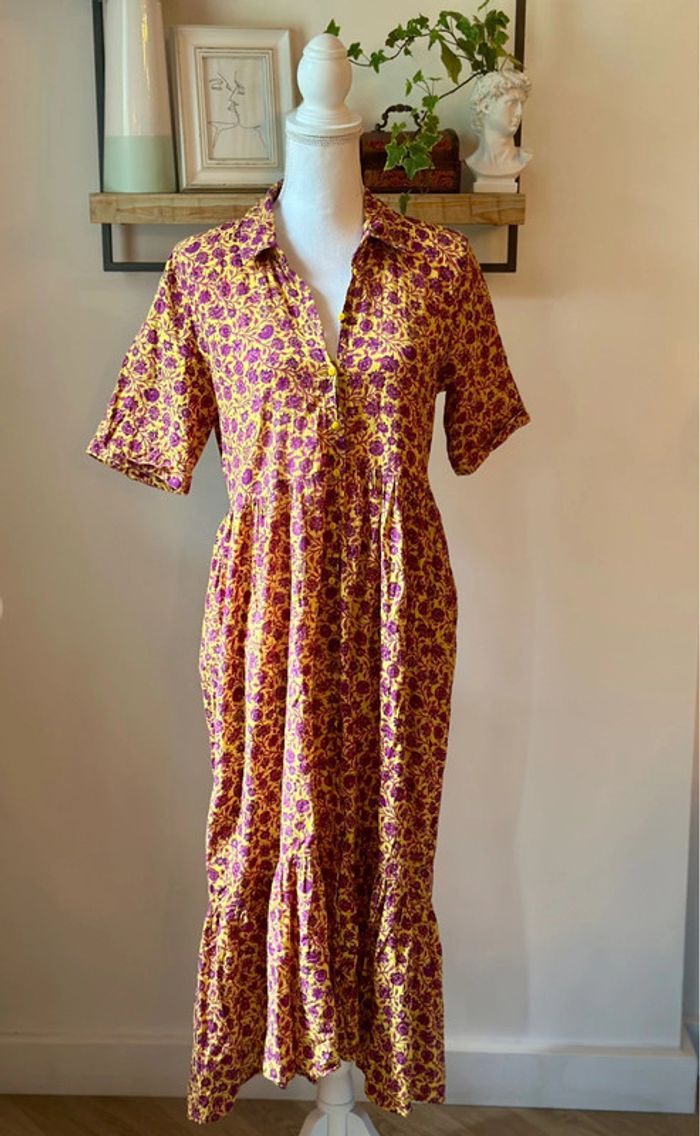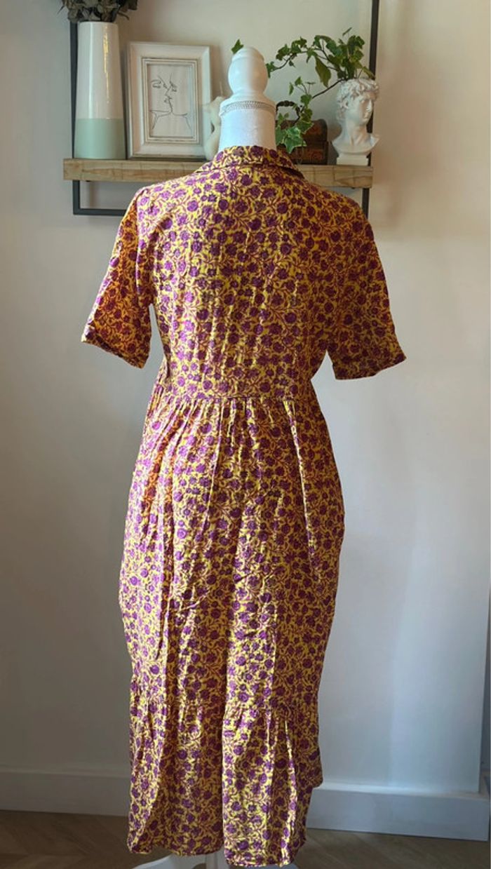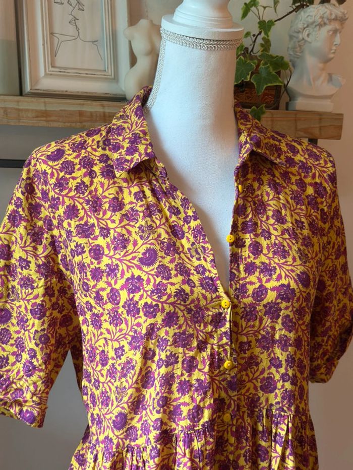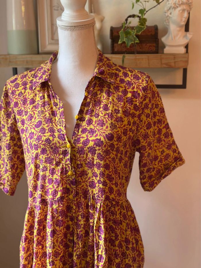 Robe midi à imprimé floral dans des tons vibrants de rose, violet et jaune orangé, signée An’ge. Coupe ample et évasée, col chemise, manches courtes, patte de boutonnage à l’avant et taille légèrement marquée pour un joli tombé fluide. Matière 100 % coton (étiquette visible sur photo). Style décontracté chic, facile à porter au quotidien ou en vacances. Taille T2 qui convient parfaitement à un 38 ok 36/38. Très bon état, aucun défaut. Longueur 120 cm. ℹ️ Photo portée générée à titre illustratif, pour vous donner une idée du rendu.