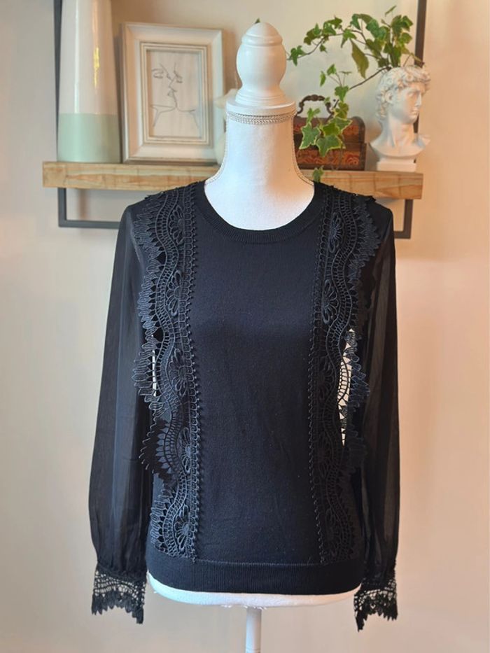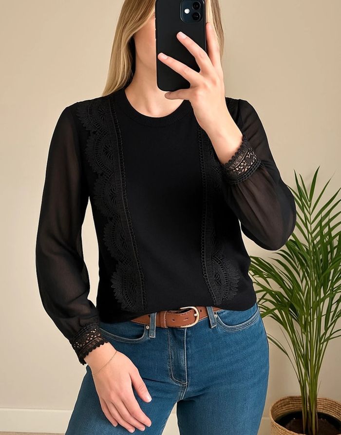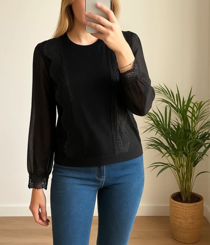 Pull léger noir Cache-Cache à manches longues, coupe droite avec empiècements en maille sur le corps et voilage léger sur les manches. Jolis détails en broderie ajourée sur le devant et aux poignets, col rond côtelé. Matière principale 70% viscose, 30% polyamide, manches 100% polyester. Style chic et féminin, parfait avec un jean ou une jupe. En très bon état. Taille bien. ℹ️ Photo portée générée à titre illustratif, pour vous donner une idée du rendu.