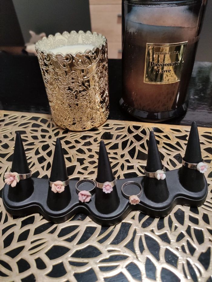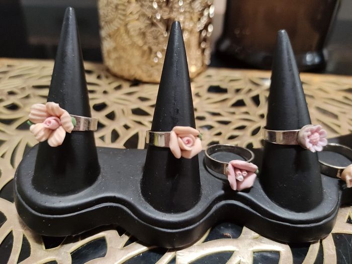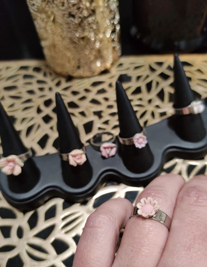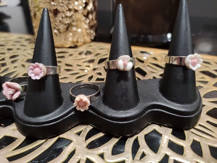 Lot de 7 bagues neuves avec fleurs aux tons pastels. Très jolies. Chaque bagues est de tailles ajustables. Le support n'est pas vendu avec, n'y même ma déco ,lol.