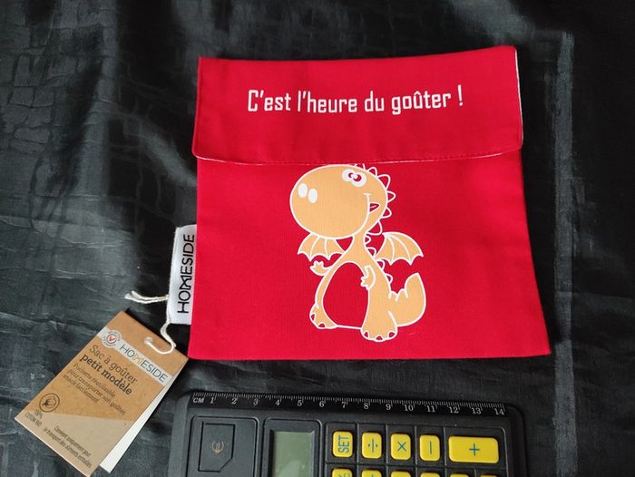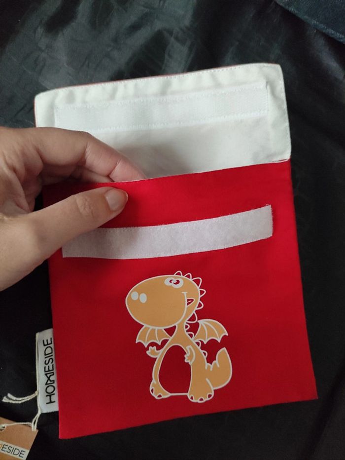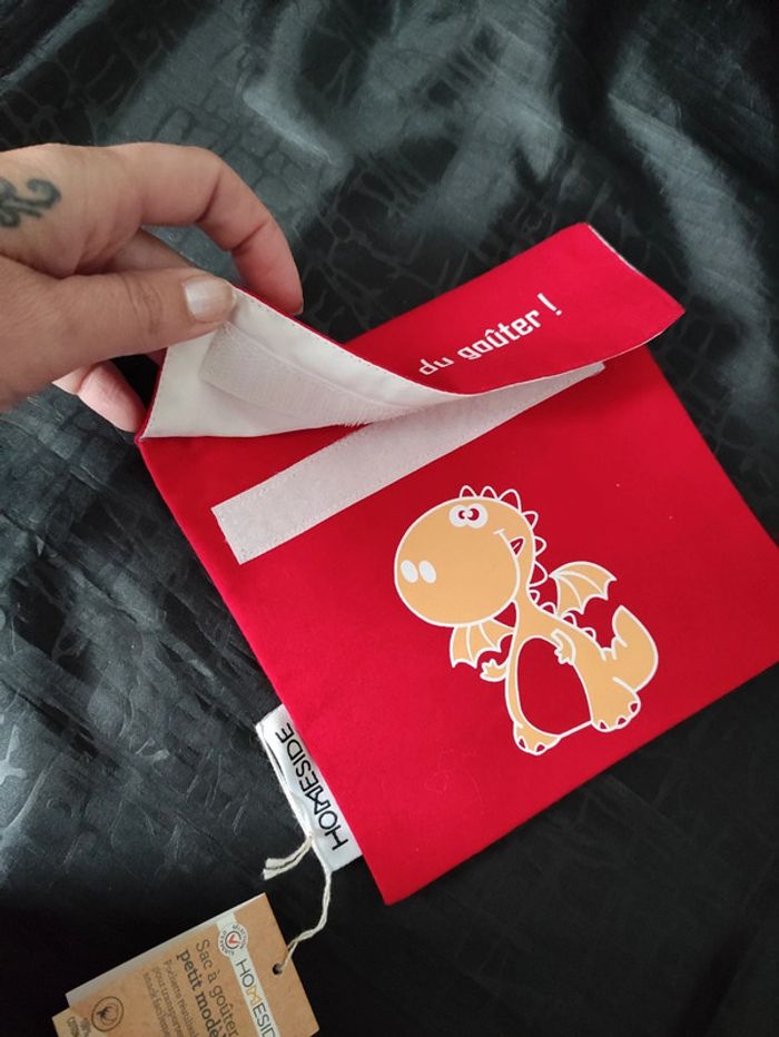 Jolie pochette rouge, pour ranger le goûter, neuve encore étiquetée. Avec un joli petit dragon dessus. Elle se ferme avec un scratch. Il y a une étiquette sur le côté pour y écrire le nom de l'enfant. En vente tel que sur mes photos. Cette annonce est pour une pochette, mais j'en ai trois à vendre, si intéressez, contactez moi avant.